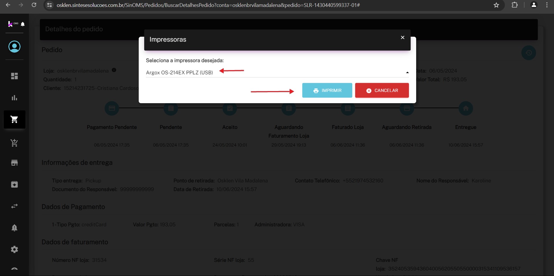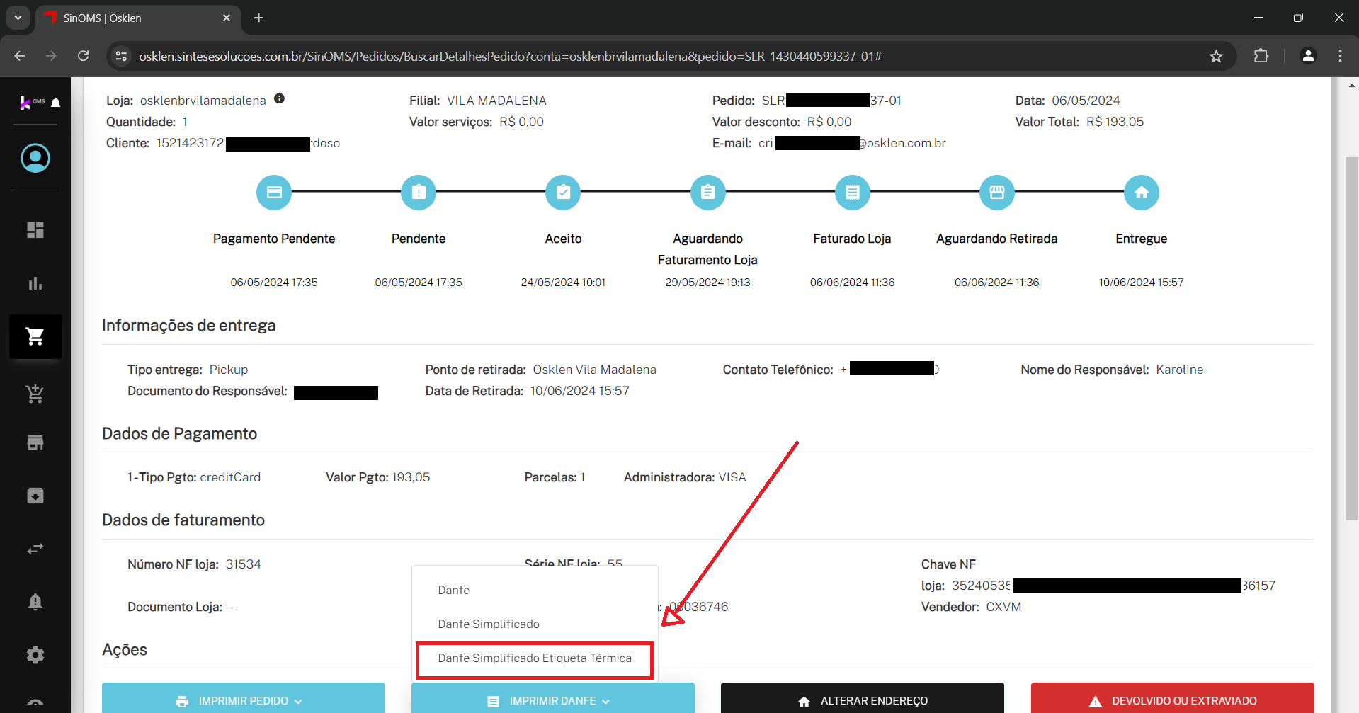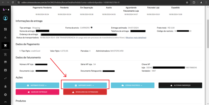 - Role a página dos detalhes do pedido até encontrar a opção Imprimir DANFE.