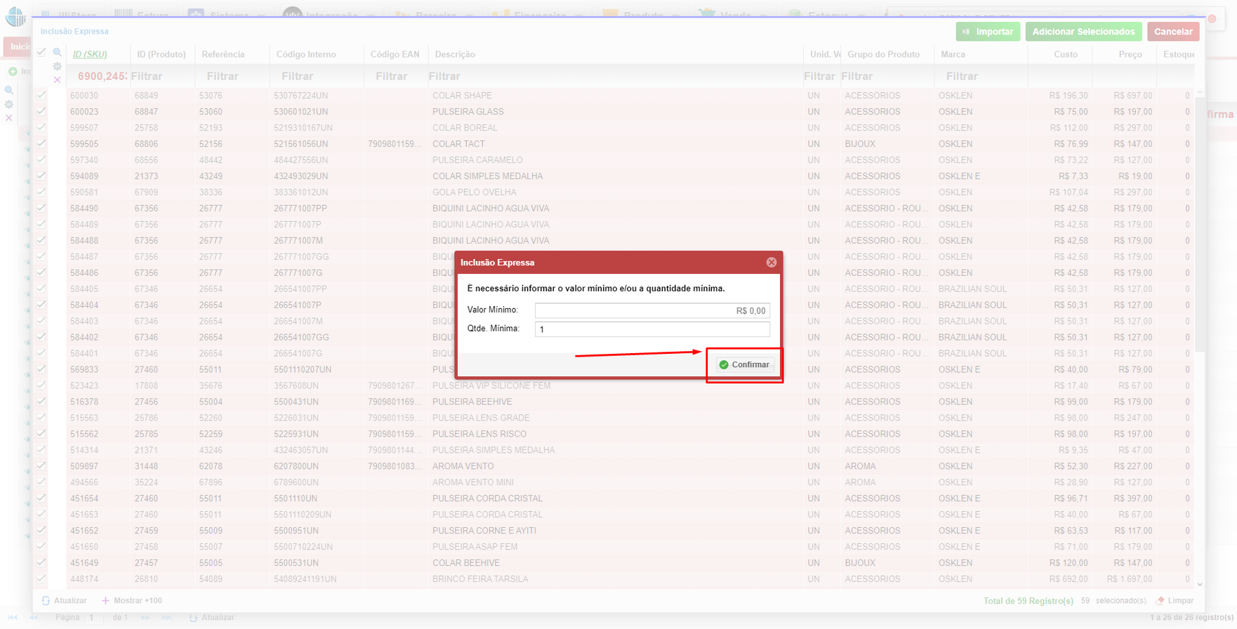 • Na próxima tela, clique em Confirmar para adicionar os produtos à condicional da sua campanha.