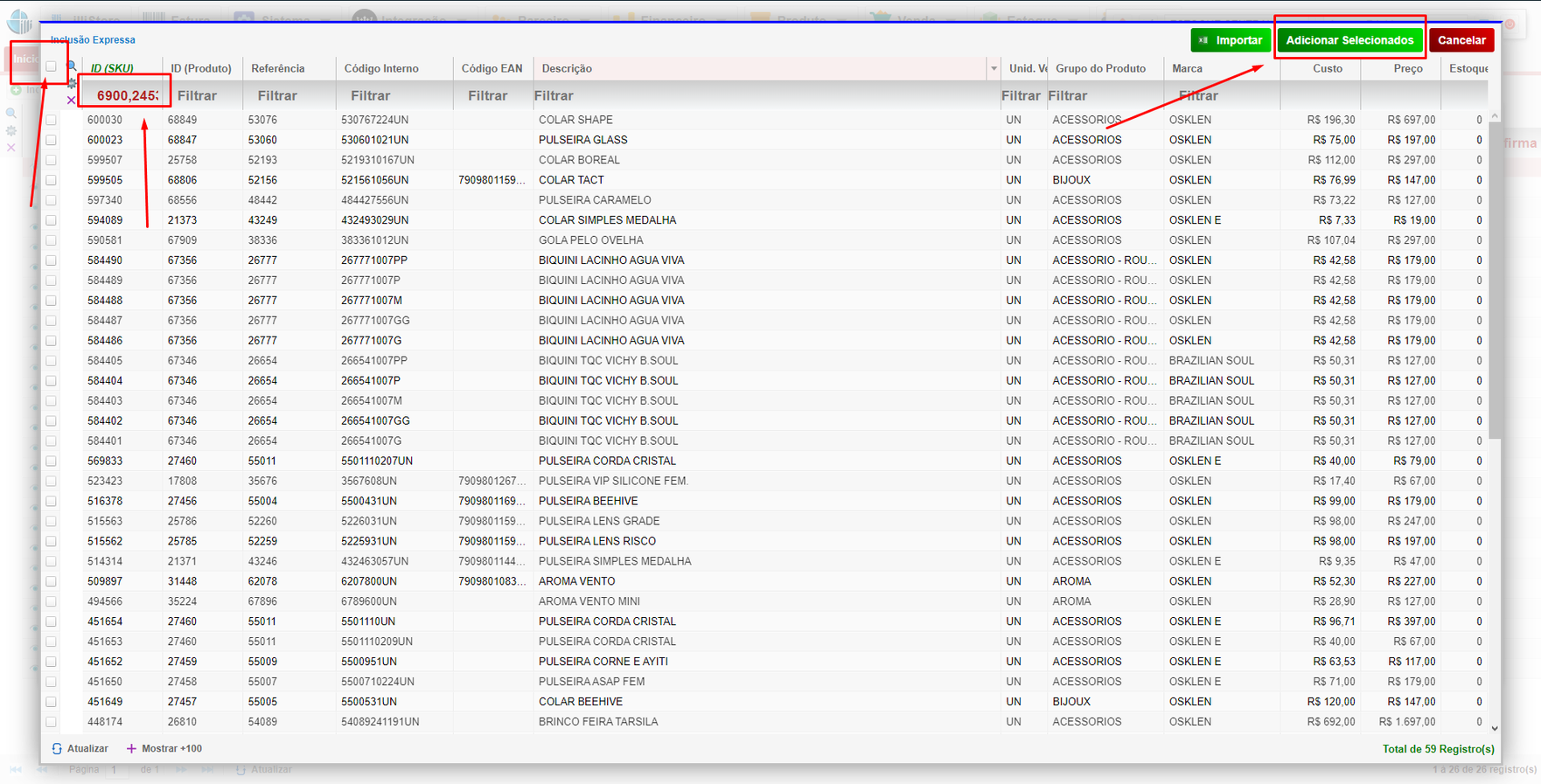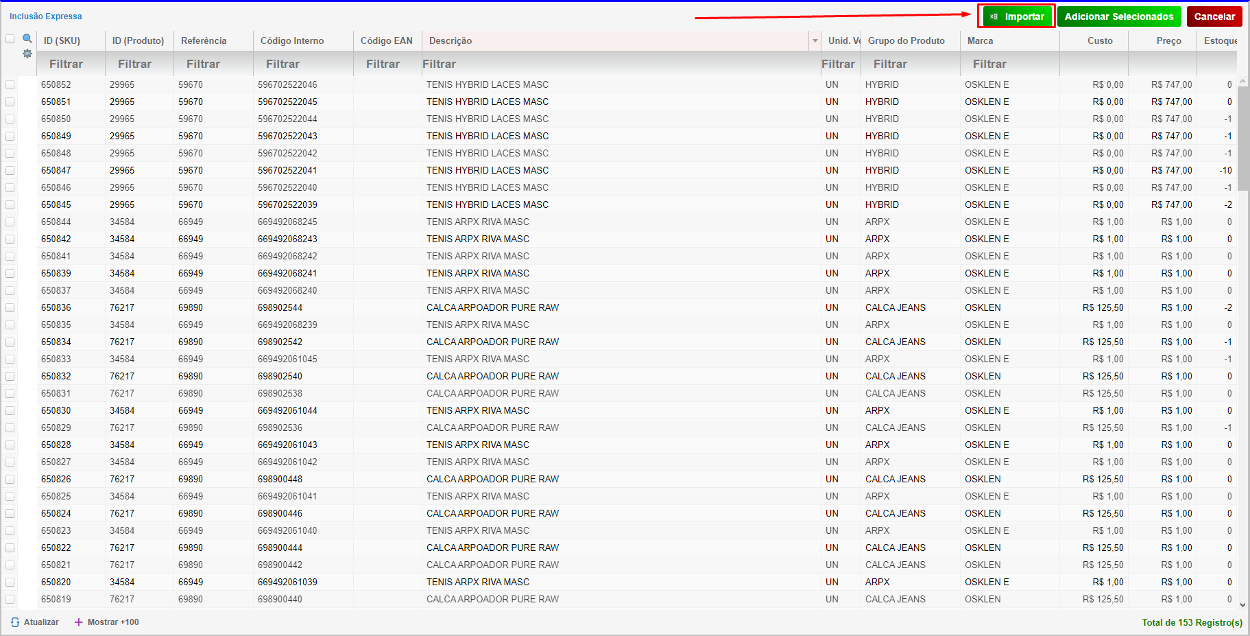 • Verifique que o campo Id (SKU) está preenchido e que a lista de produtos importados aparece na tela.