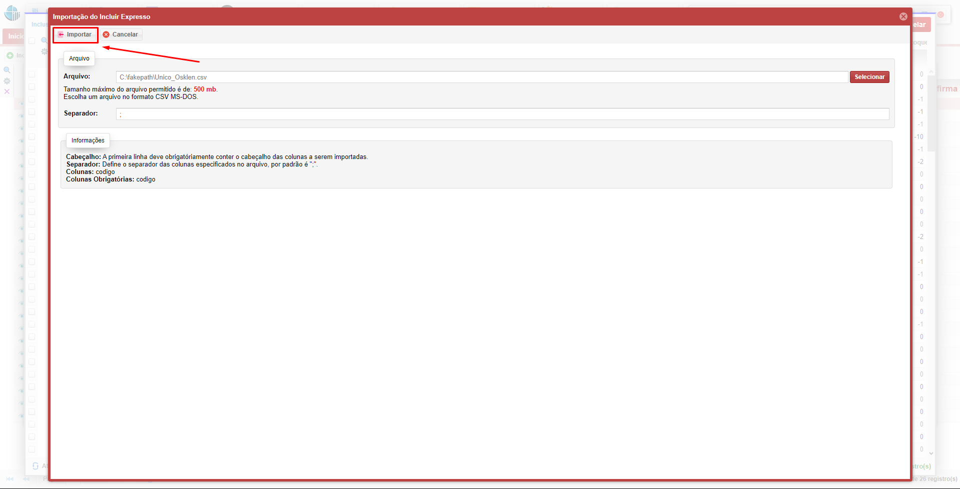 • Em seguida, clique em Importar para iniciar o processo de importação do arquivo.