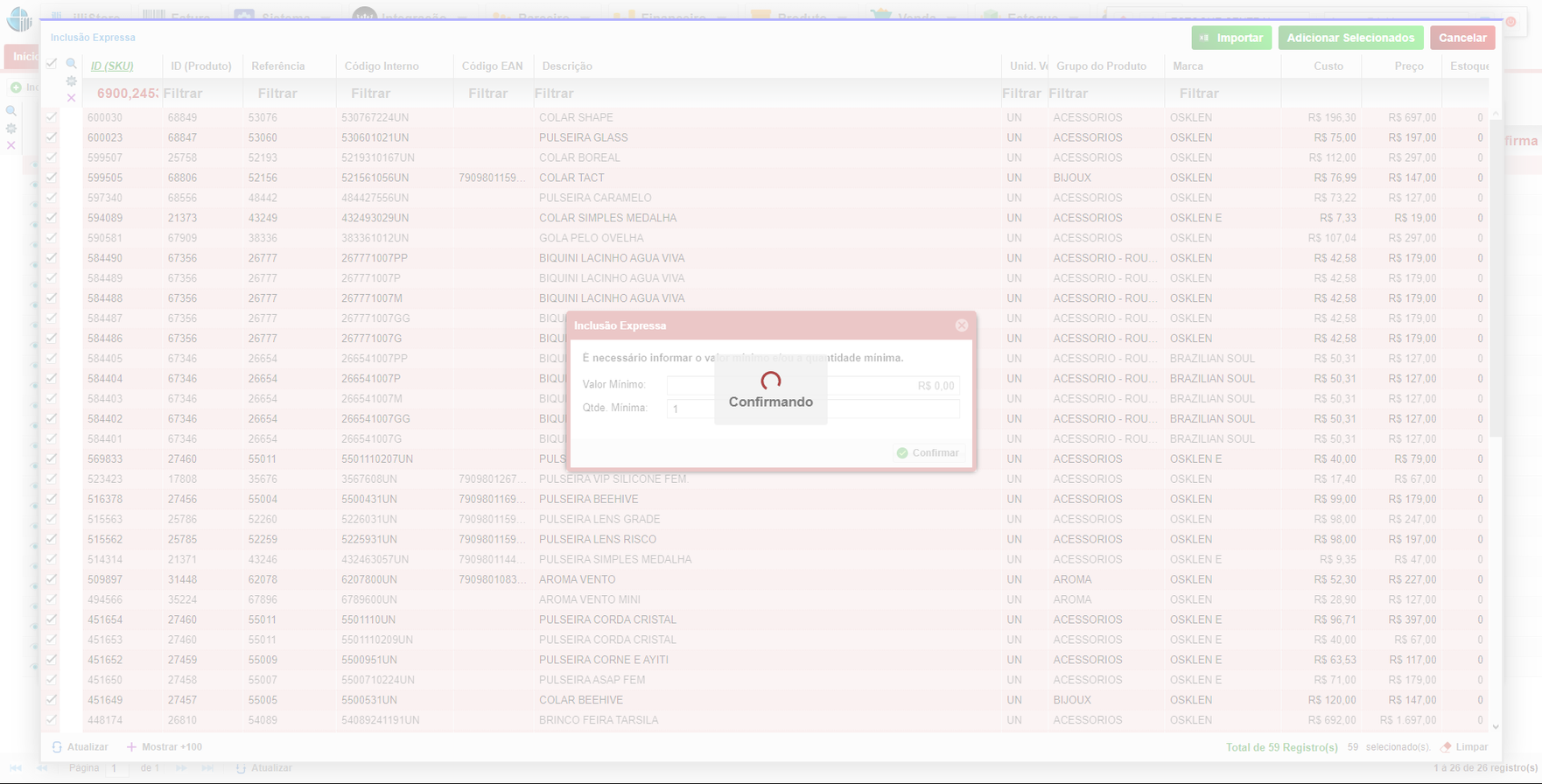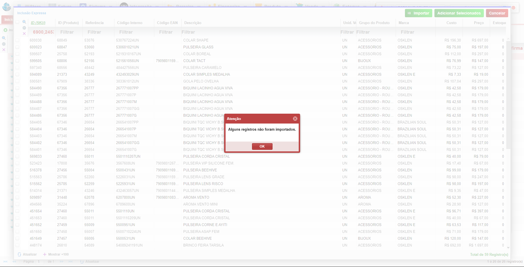 • Após clicar em Importar, aguarde a finalização do processo. Se ocorrer um erro ou algum produto não for importado, uma mensagem será exibida.
