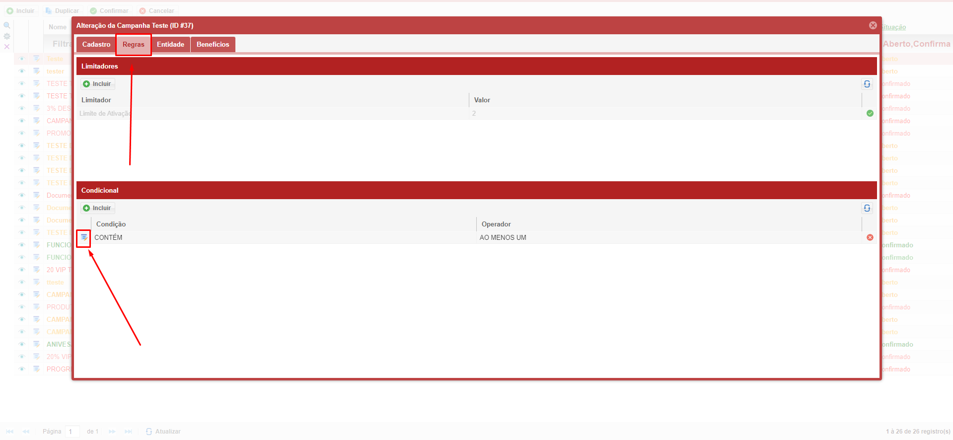 • Clique no botão de Editar na condicional onde deseja importar os produtos.