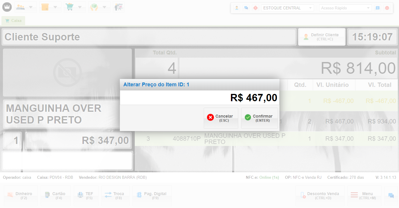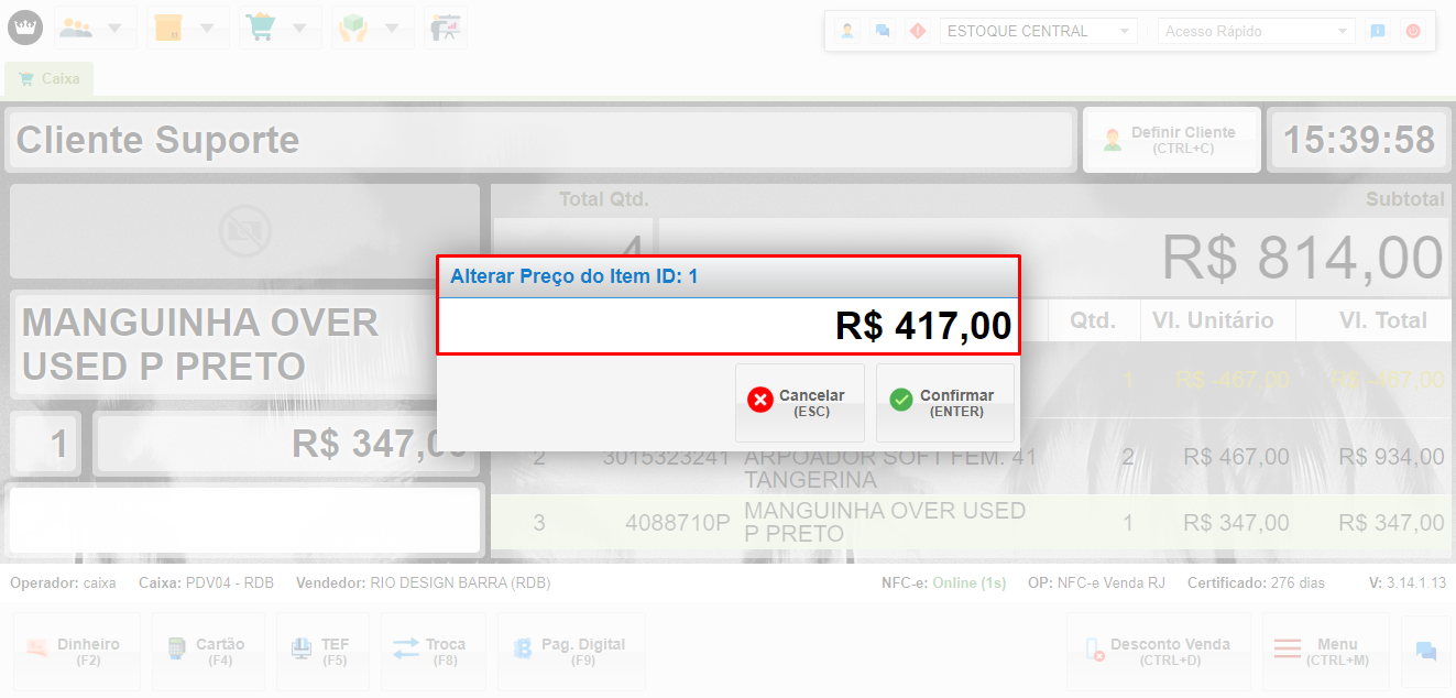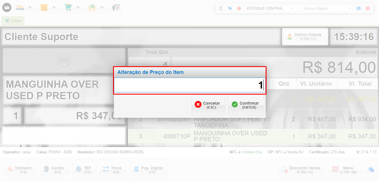• Após confirmar você pode verificar que foi alterado no próprio carrinho e finalizar a venda de forma normal.