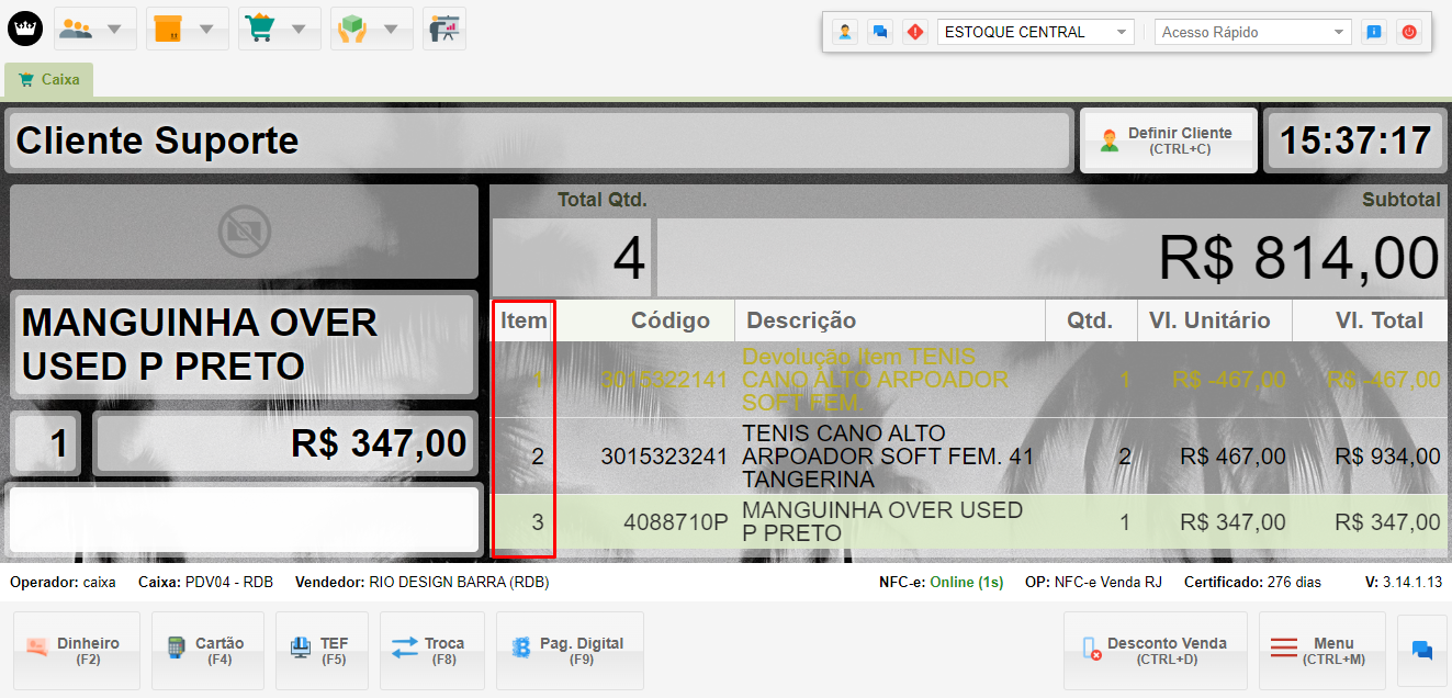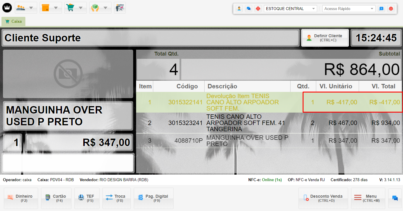 • Valor Negativo: O valor dos produtos em troca expressa aparecerá com um símbolo negativo, indicando que são itens de troca.
