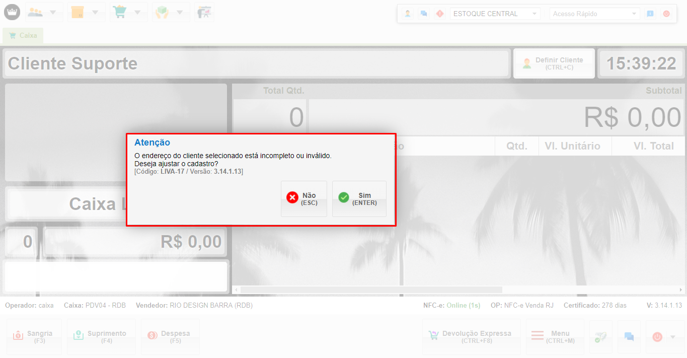 • Para realizar a devolução o cadastro do cliente precisa está completo, caso o cliente não tenha seu cadastro completo, o sistema vai acusar e sinalizar para que o cadastro seja atualizado. Clique em “Sim”.