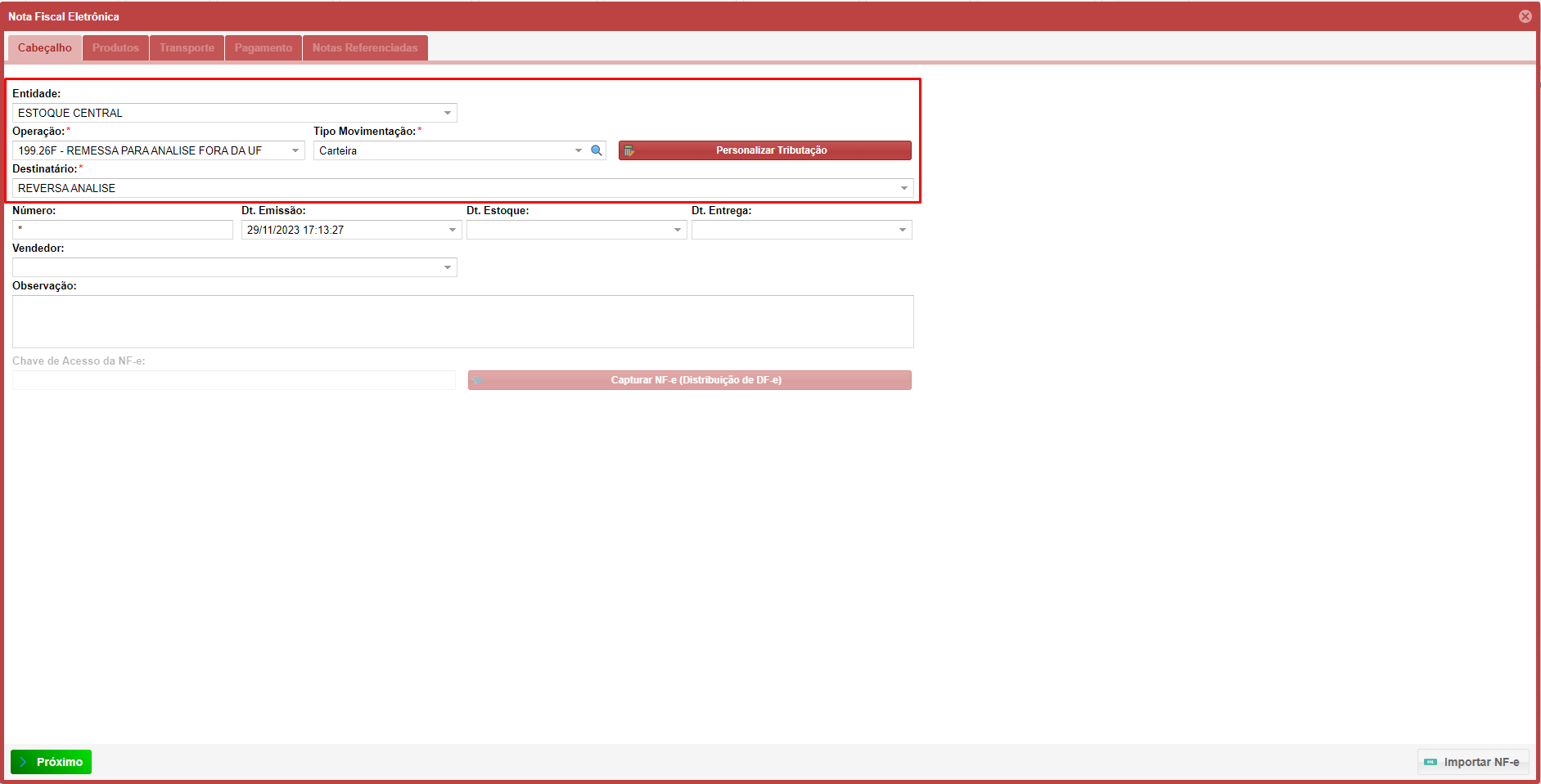 1. Cadastrar uma NF-e de Remessa para Análise