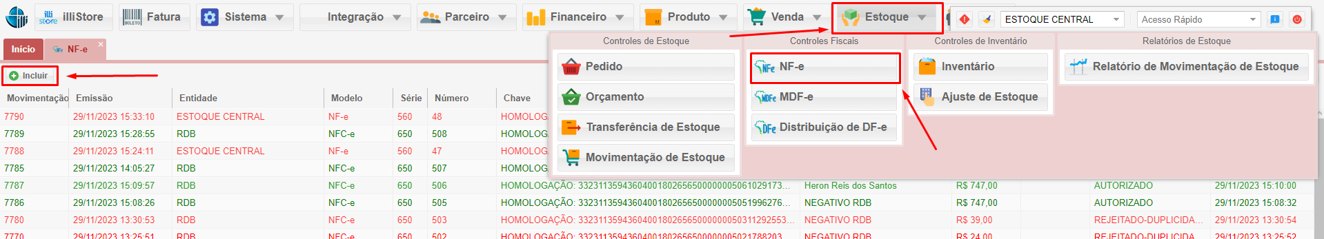 - No sistema, vá até a aba Estoque e selecione Controles Fiscais (NF-e).