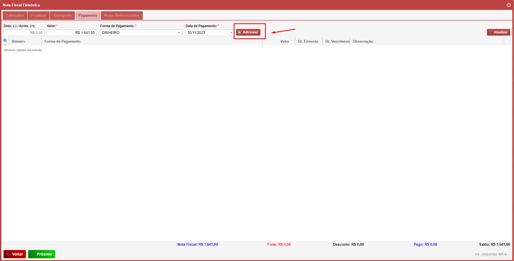 - Clique em Próximo e, na tela seguinte, adicione os produtos retirados.
