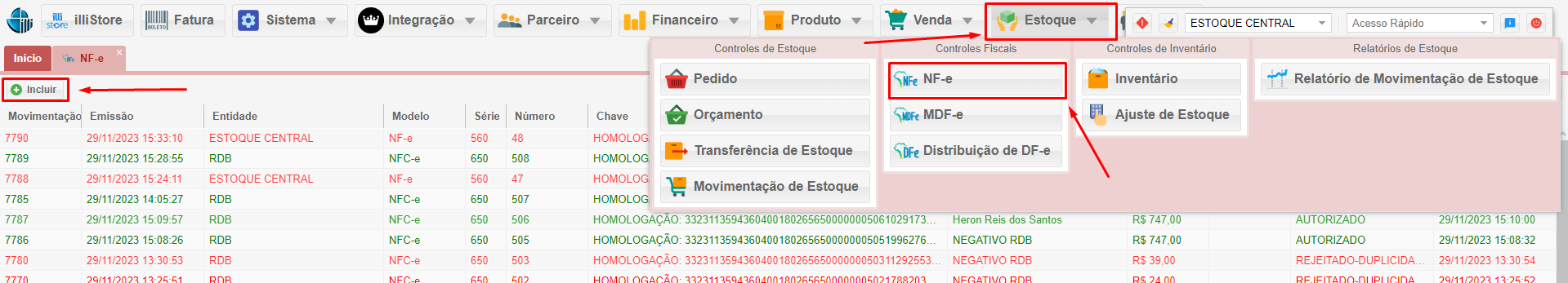 Para cadastrar a nota, vá na aba Estoque → Controles Fiscais (NF-e) e depois em Incluir.
