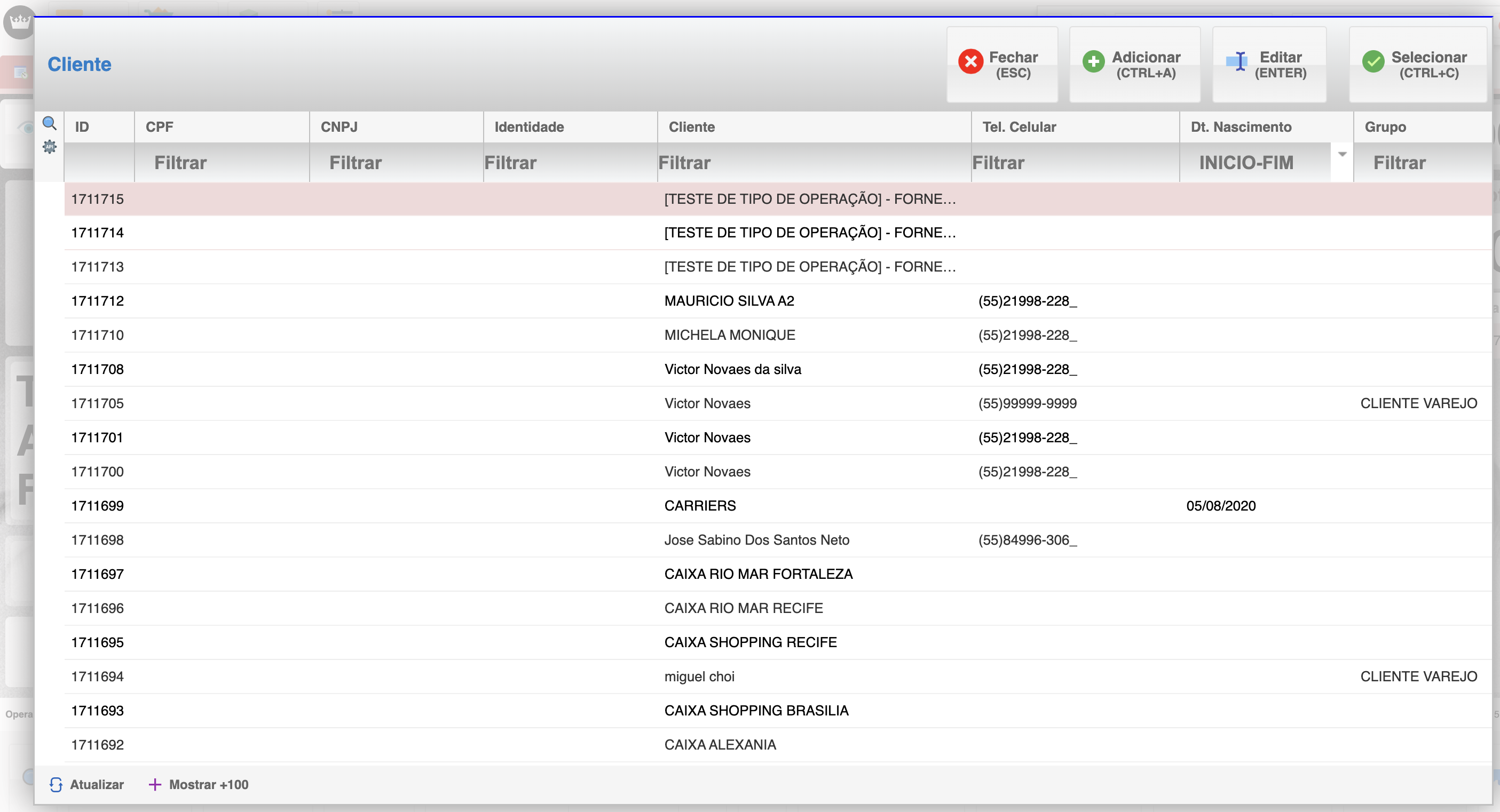 - Utilize os campos de pesquisa como CPF, CNPJ, Identidade, e Tel. Celular para localizar o cliente.