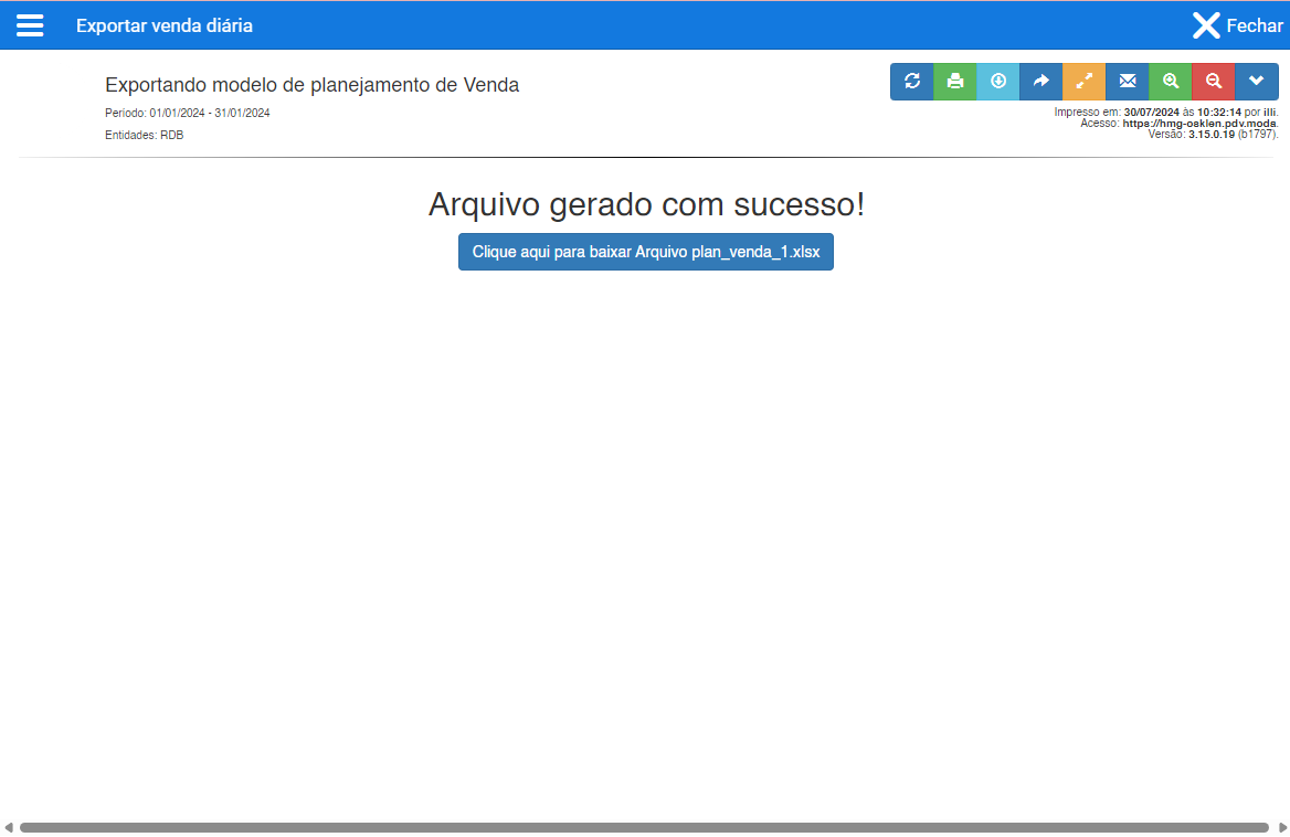 - Após selecionar os parâmetros, clique em Carregar. Um arquivo Excel será gerado com o nome "plan_venda_.xlsx".