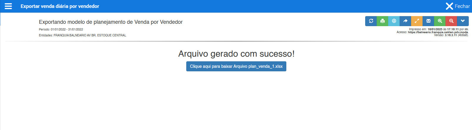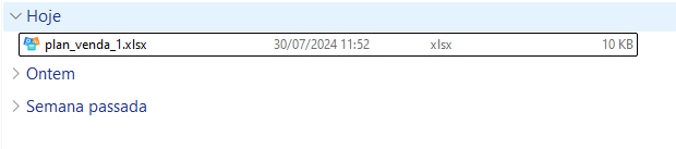 - Após selecionar os parâmetros, clique em Carregar. Um arquivo Excel será gerado com o nome "plan_venda_.xlsx".