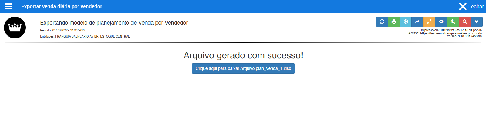 • Após selecionar os parâmetros, clique em Carregar. Um arquivo Excel será gerado com o nome "plan_venda_.xlsx".