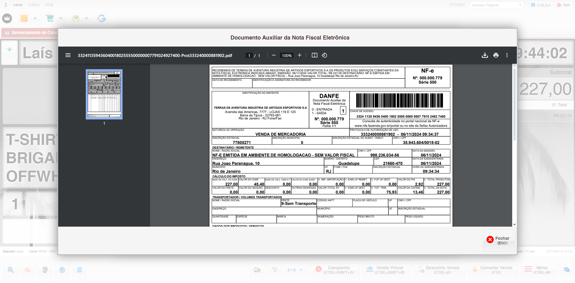 • Após selecionar a forma de pagamento e finalizar a venda é gerada a Danf-e.