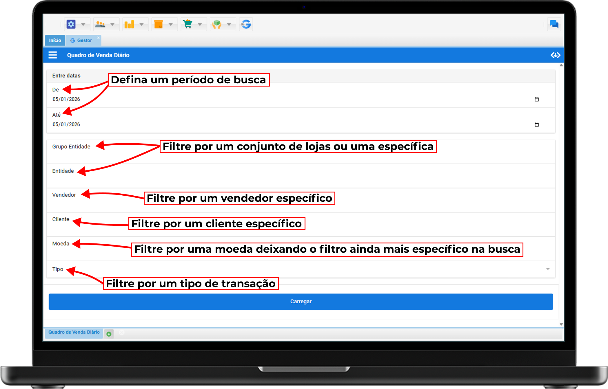 Após configurar os filtros, clique no botão azul Carregar.