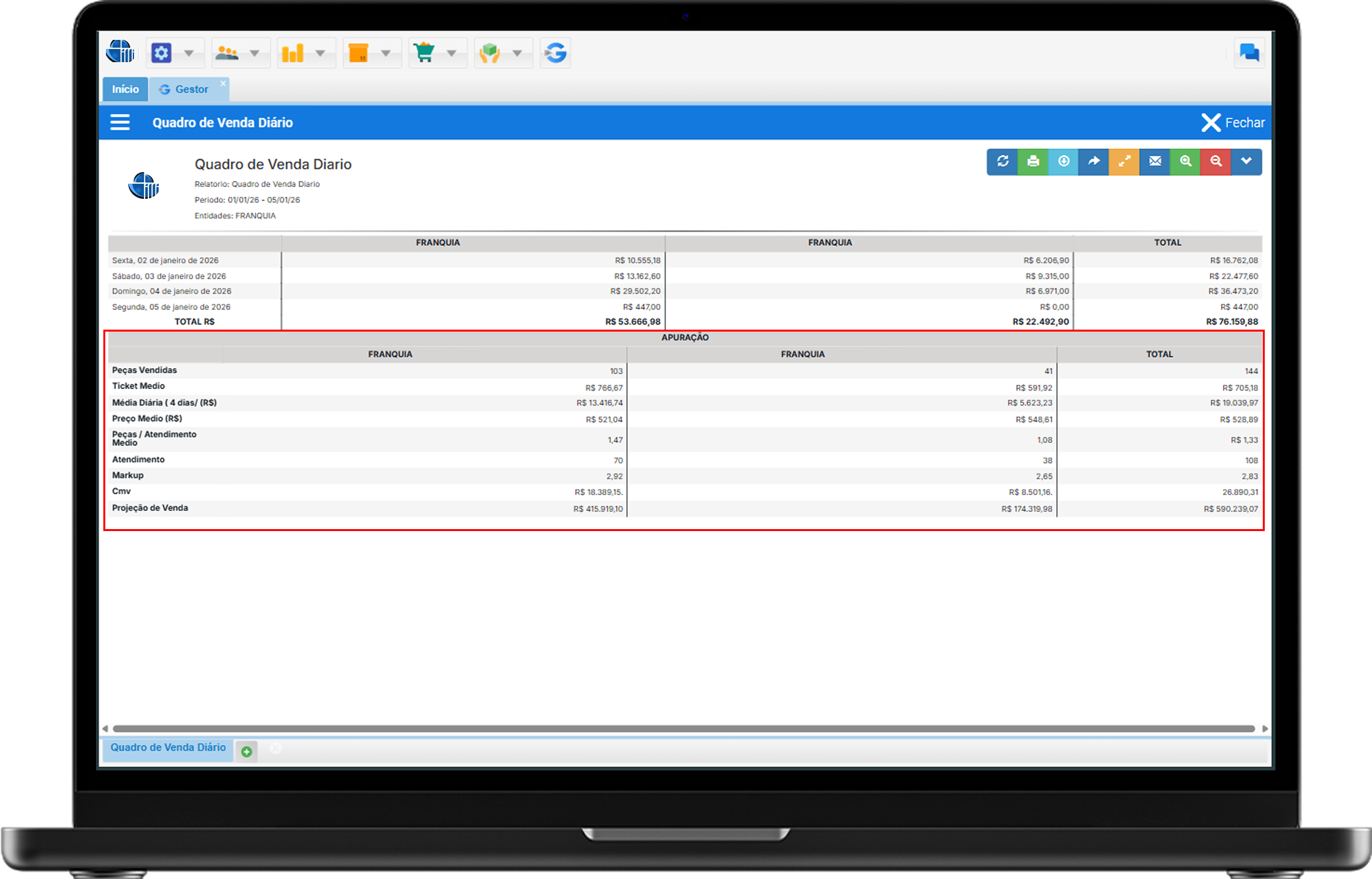 O Quadro de Venda Diário é uma ferramenta estratégica que oferece uma visão detalhada do faturamento e dos principais indicadores de desempenho da sua loja por dia. Este relatório é essencial para o acompanhamento da saúde financeira e para atender exigências administrativas.