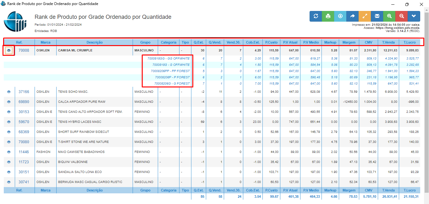Permite a filtragem com base em várias formas de identificação do produto:- Grupo do Produto: Exemplo - Acessório, Bermuda, Calçado, etc.