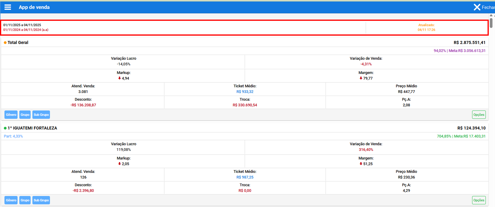 Cabeçalho: No topo, você vê o período selecionado e a comparação com o mesmo período do ano anterior (marcado como a.a). Você pode clicar no texto Atualizado: para recarregar os dados na hora.