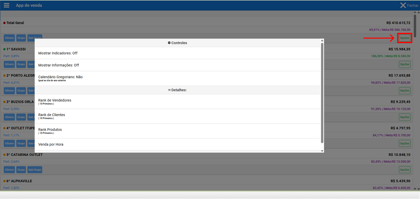 Em cada card (seja no Total Geral ou em uma Loja), você tem um botão Opções para relatórios e configurações rápidas.