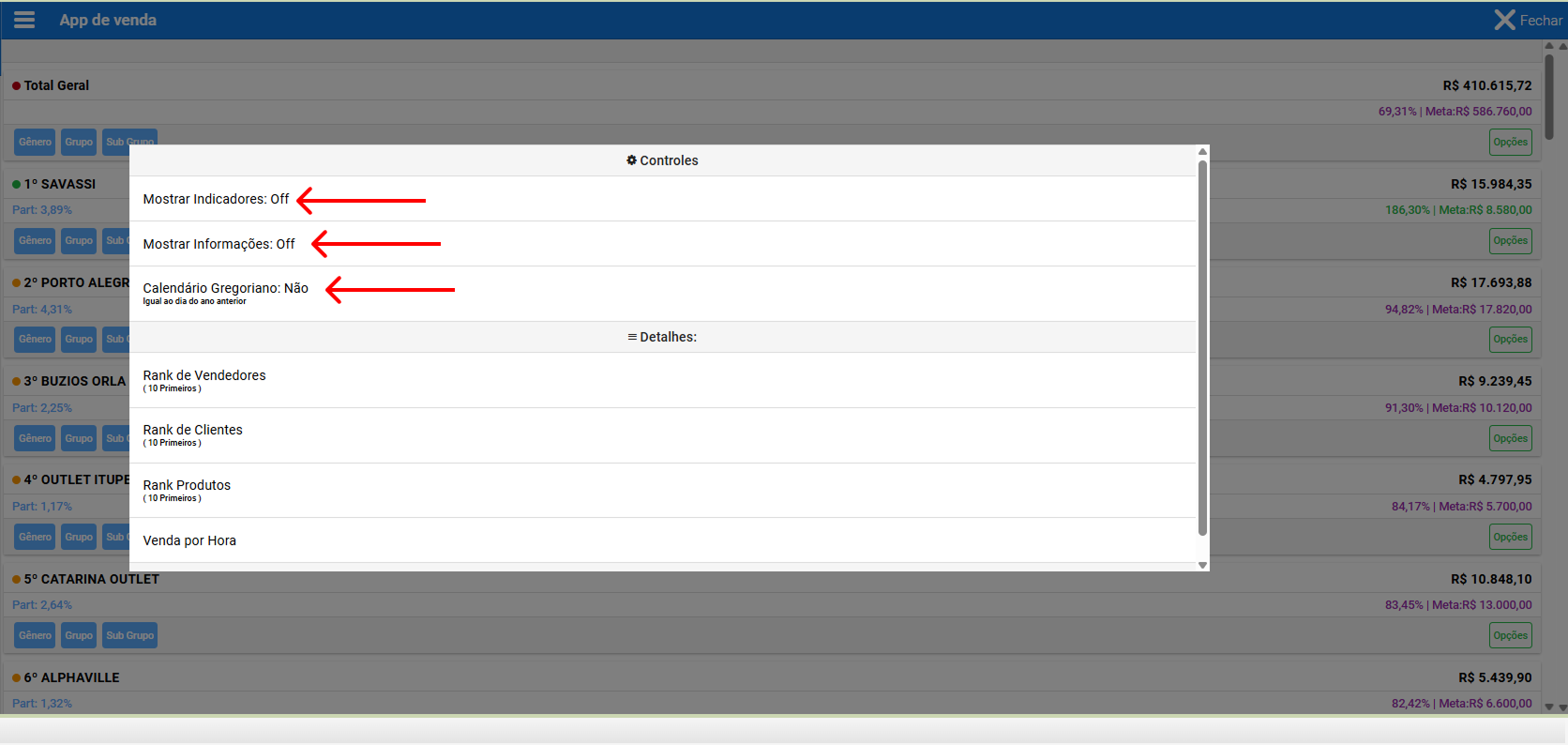 Mostrar Informações: Liga ou desliga os indicadores Atend. Venda, Ticket Médio, Preço Médio, Desconto, Troca, Pç. A.