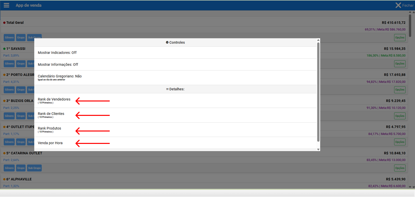 Você pode ver os dados de todas as lojas ou filtrar por um supervisor específico.