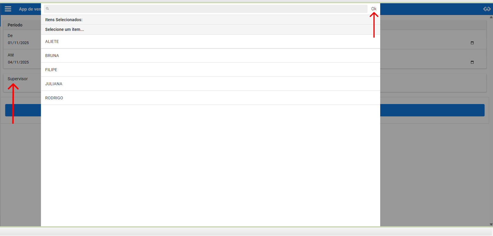 Clique no campo Supervisor para abrir a lista e toque no nome que deseja, clique em "OK". (Se deixar em branco, o relatório mostrará todas as lojas).