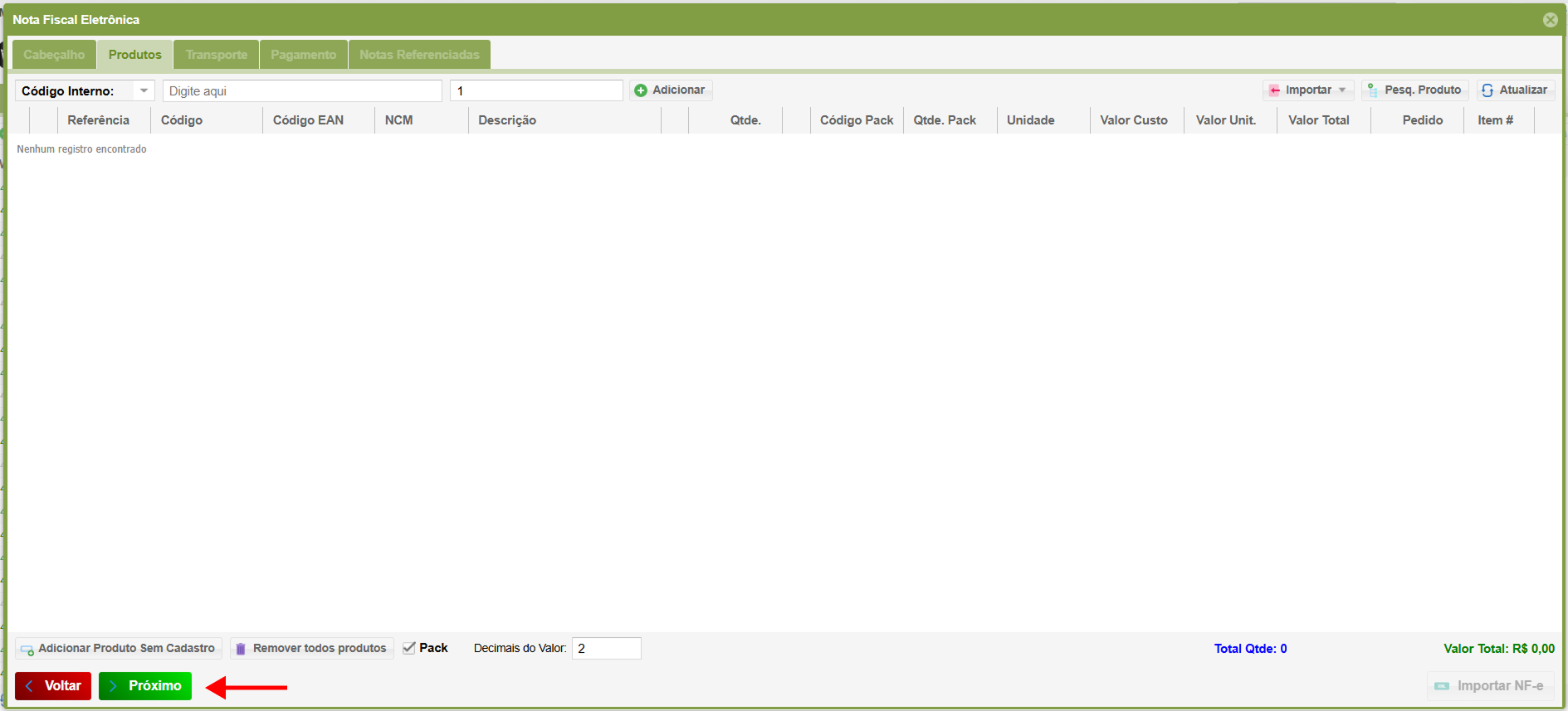 - Na aba de Produtos, adicione os produtos a serem enviados. Quando finalizar clique em Próximo.