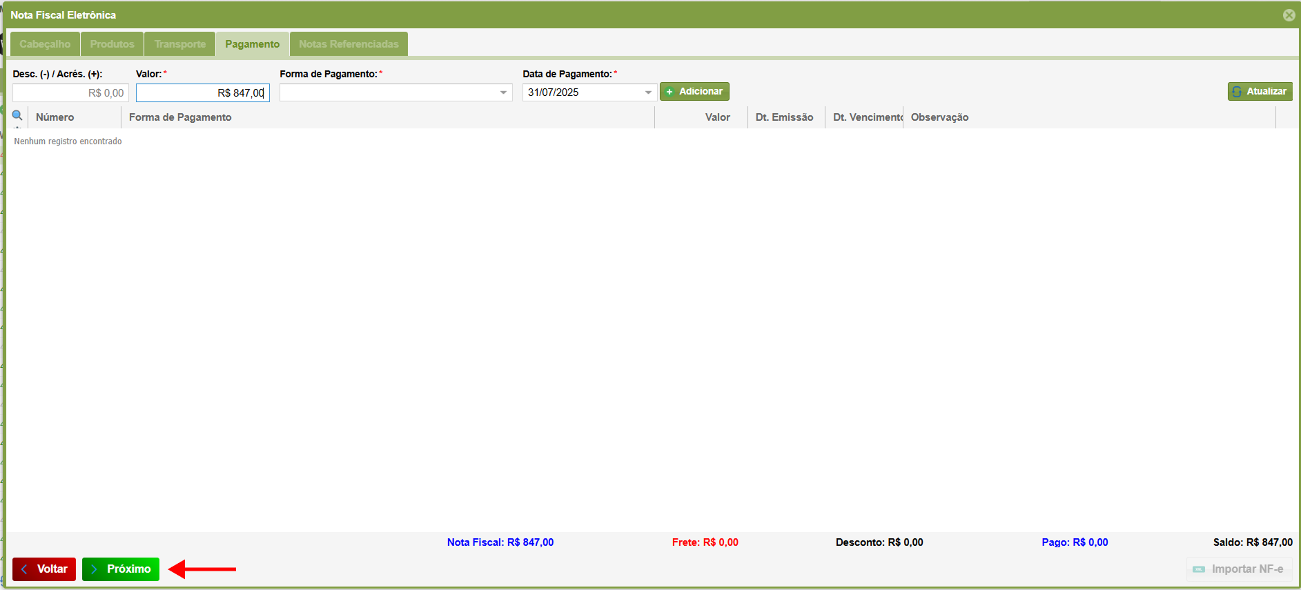 - Na aba Pagamento, preencha os campos Valor, Forma de pagamento e clique em Adicionar. Em seguida clique em Próximo.