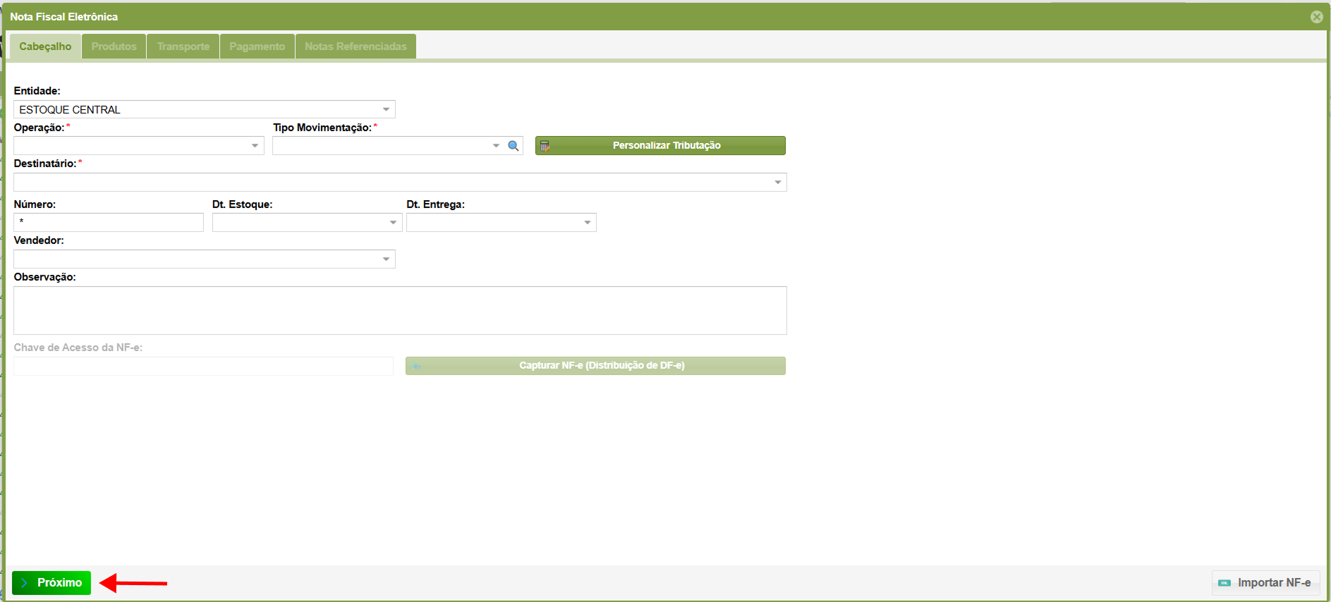 - Preencha os dados do Cabeçalho normalmente. Quando finalizar, clique em Próximo.