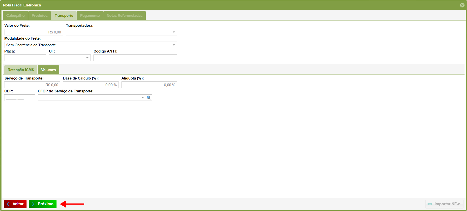 - Na aba de Transporte, preencha as informações se necessário. Clique em Próximo.