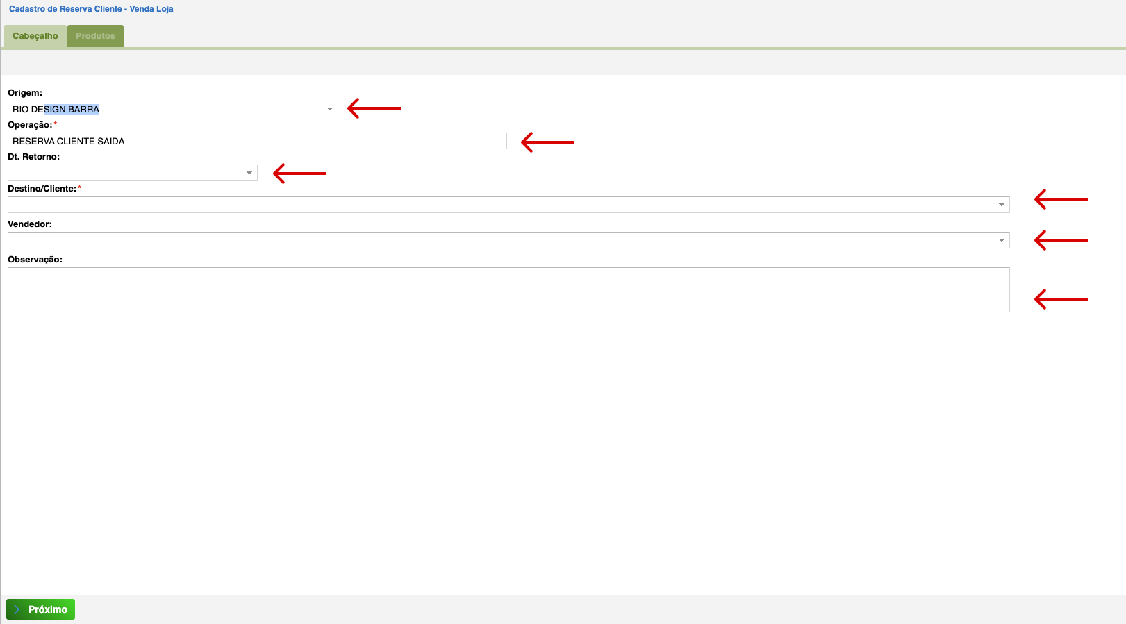 - Origem: Indique a origem do produto que será reservado.