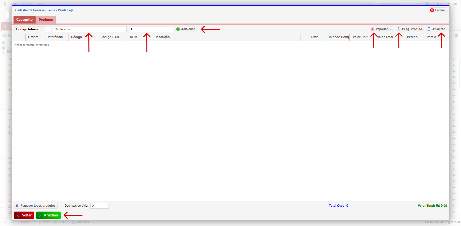 - Pesq. Produto: Abre uma lista para selecionar produtos já cadastrados no sistema.