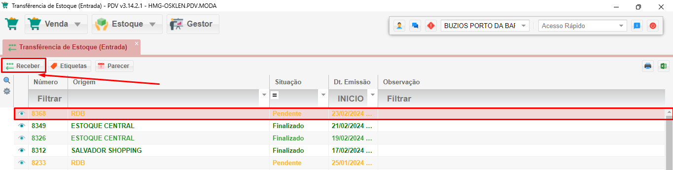 • Utilize filtros como Origem, Dt. Emissão e Observação para facilitar a busca pela transferência.
