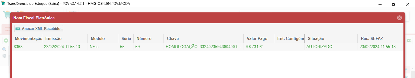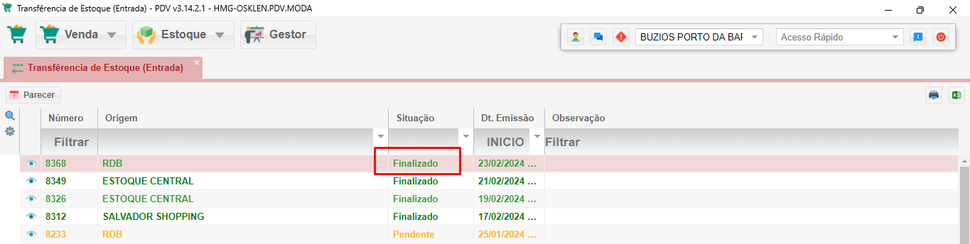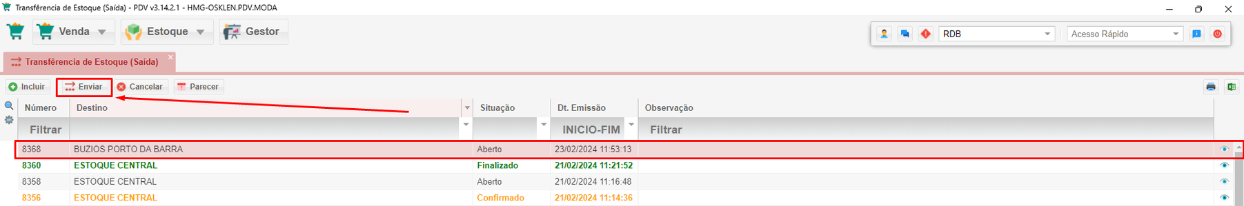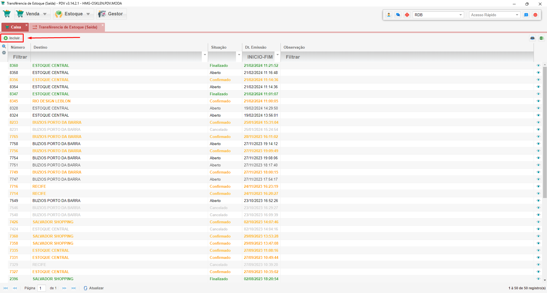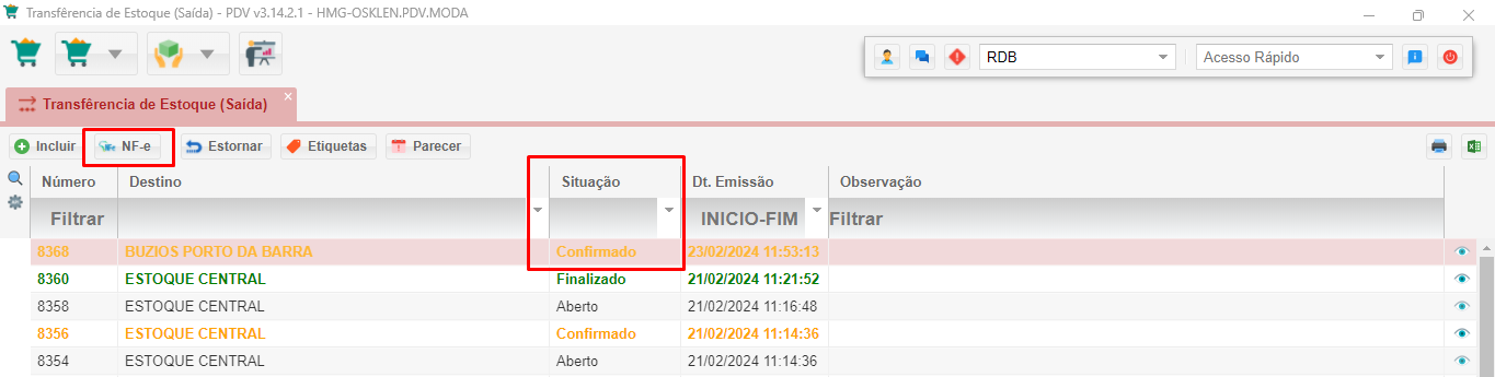 • A transferência ficará com a situação Confirmada, pronta para emissão da NF-e.