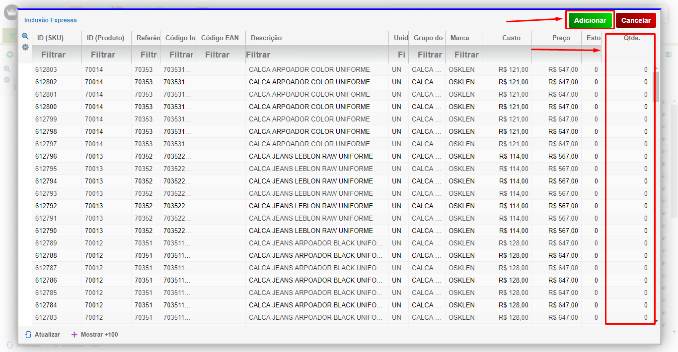 • Altere o campo Qtde conforme necessário e clique em Adicionar.