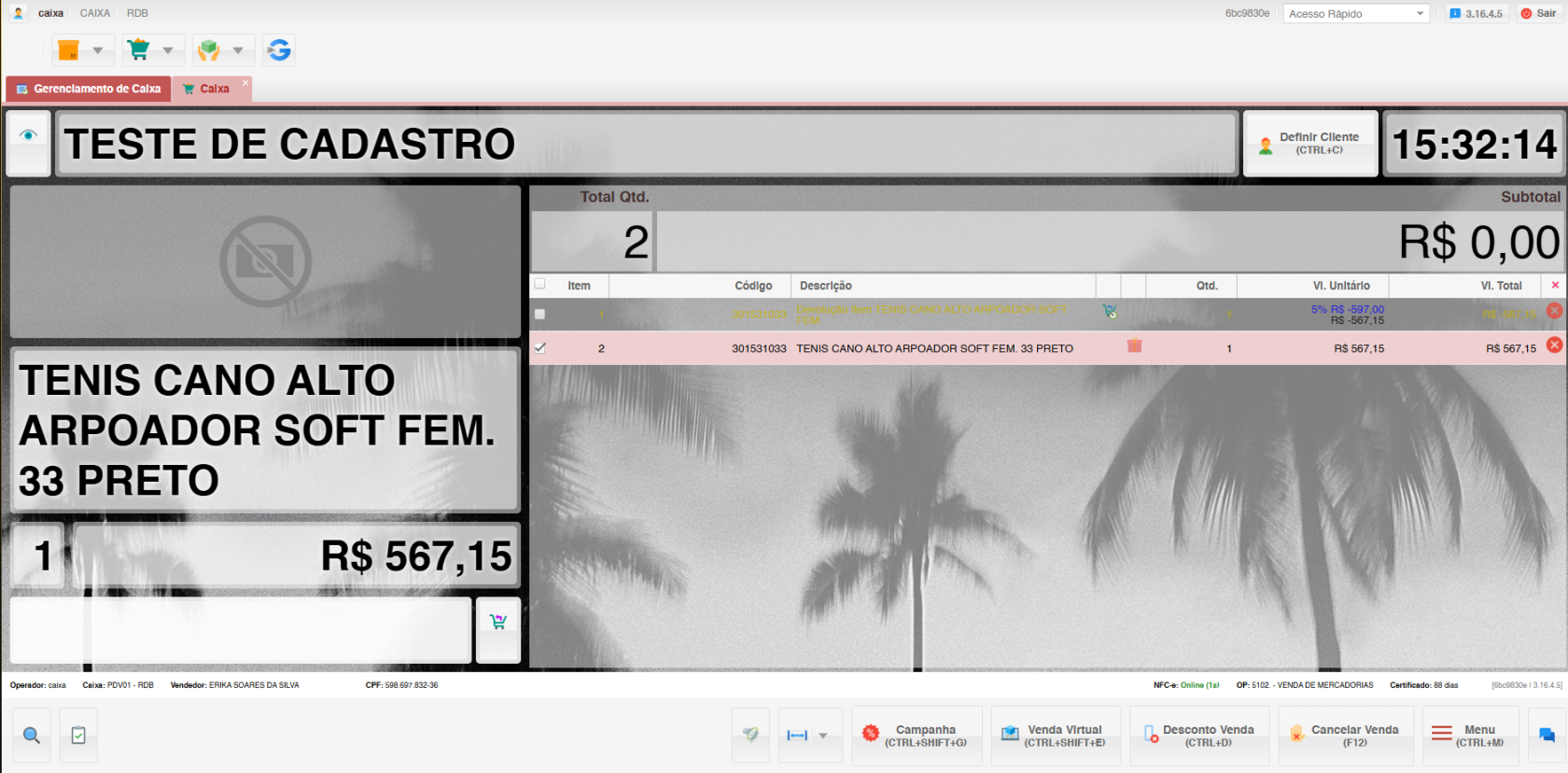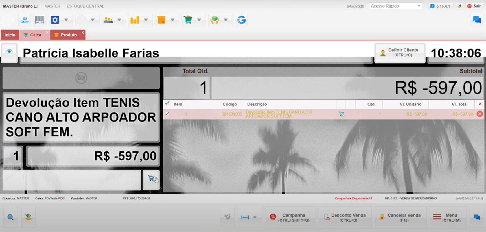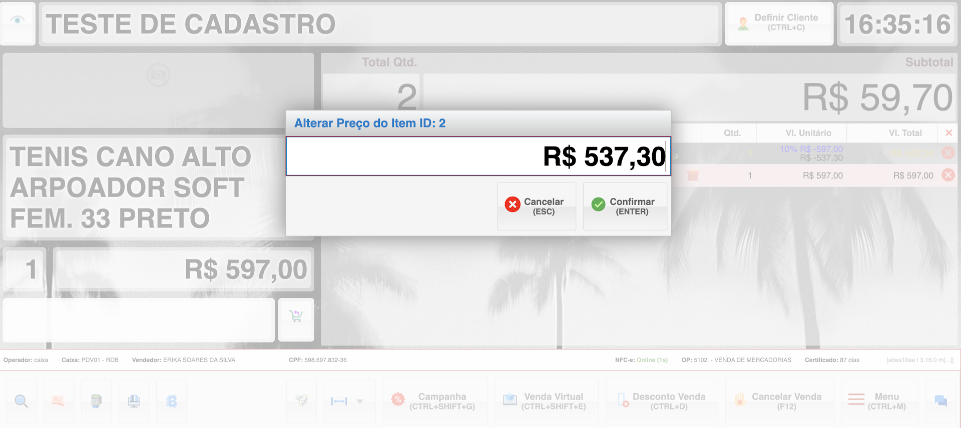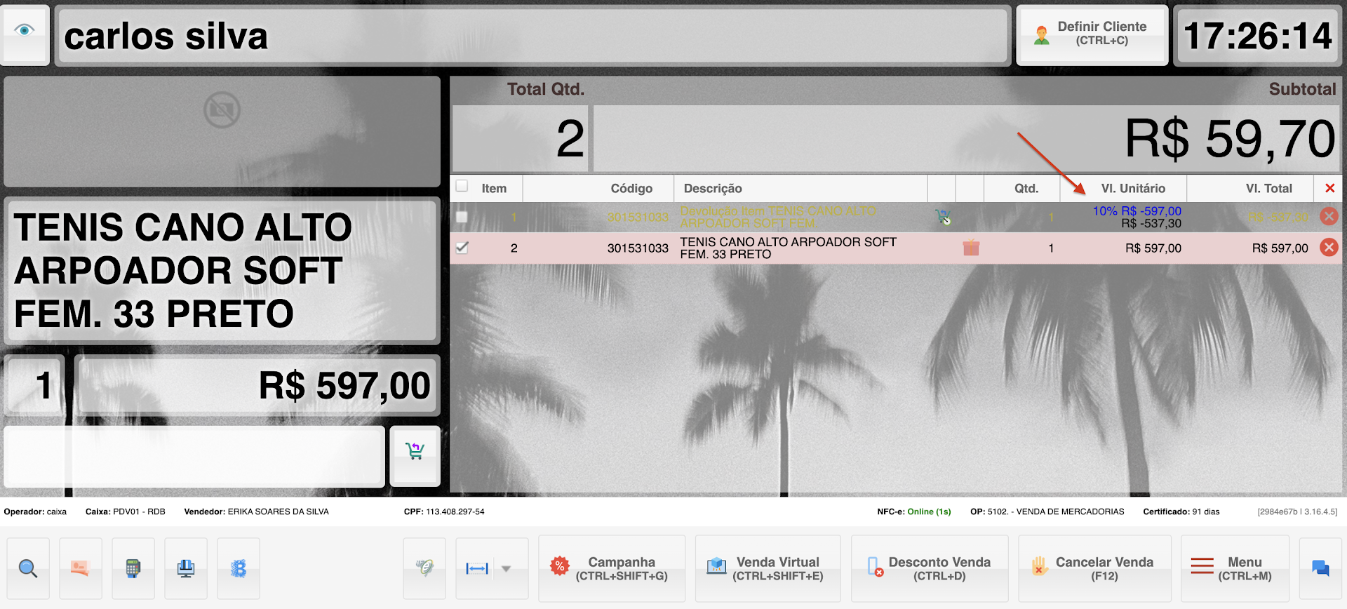 • Solução: Utilizando o atalho Ctrl + P, o preço do novo tênis é ajustado para R$ 537,30, igual ao valor do produto devolvido.