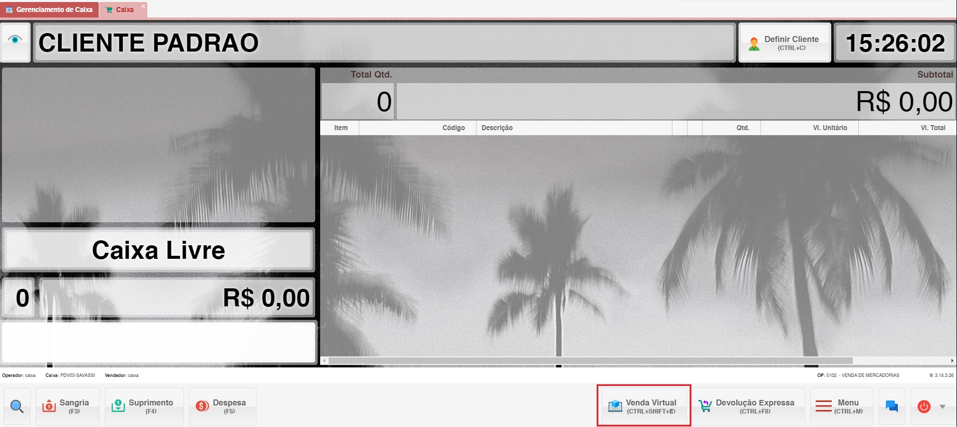 - No PDV (ponto de venda) aberto, clique em Venda Virtual ou pressione CTRL+SHIFT+E no teclado.