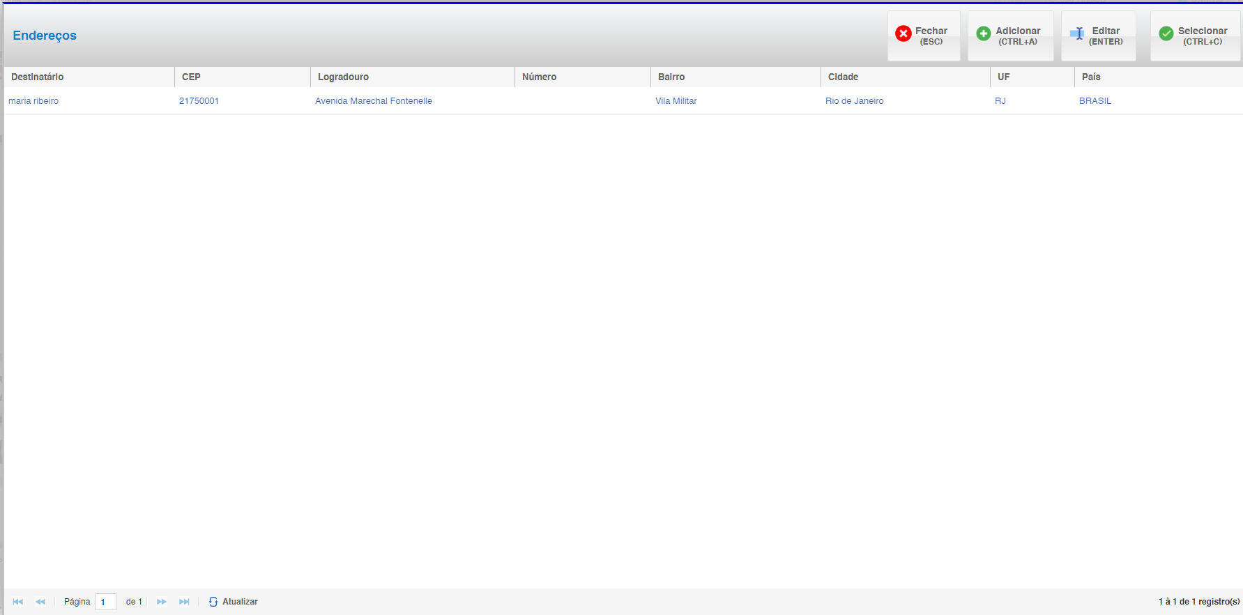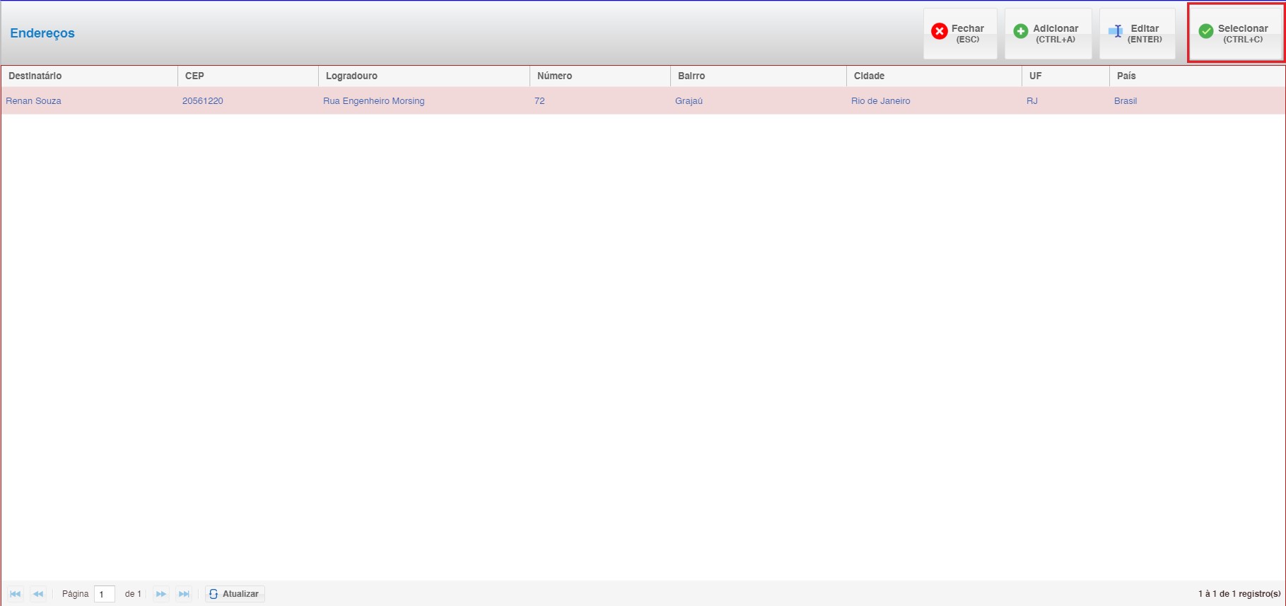 - Clique na opção Endereços (atalho CTRL+E) para gerenciar os endereços disponíveis.