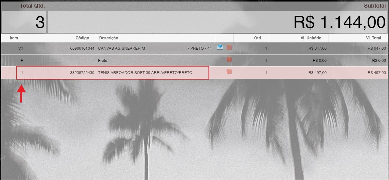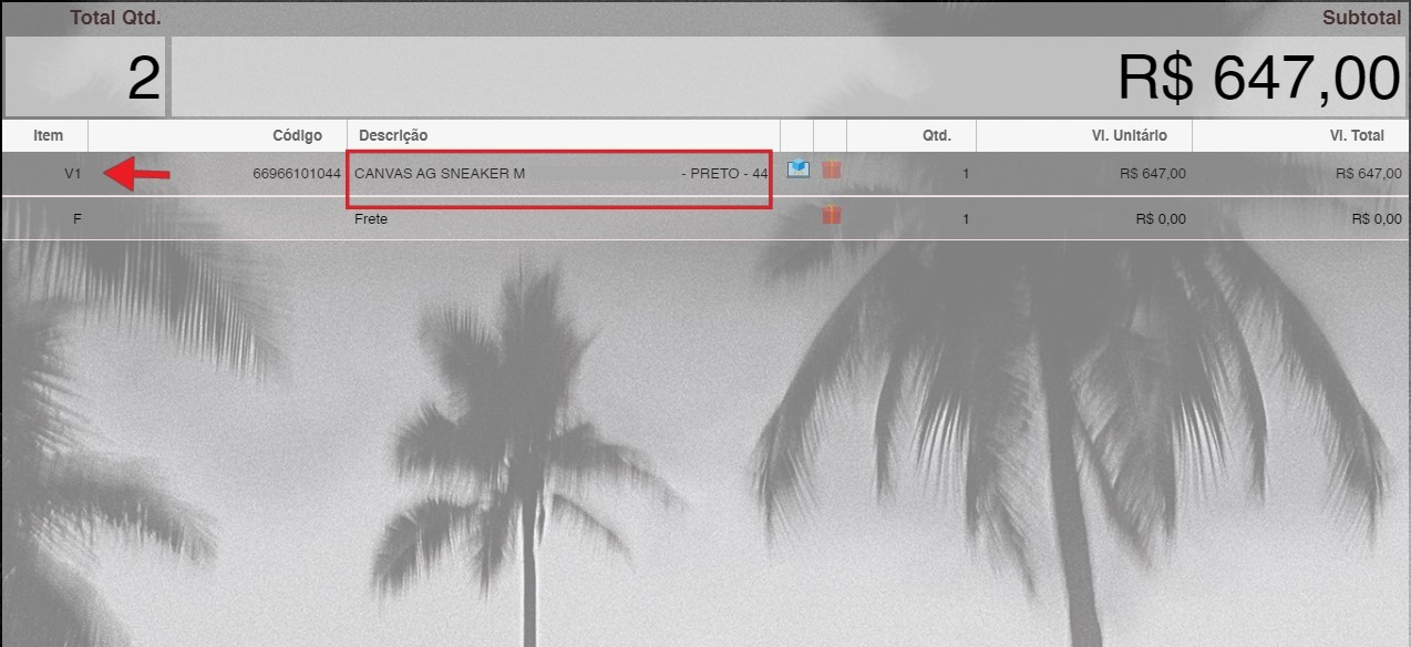 - Ao voltar para o PDV, os itens da venda virtual aparecerão com a letra V e um número na lista de compras.