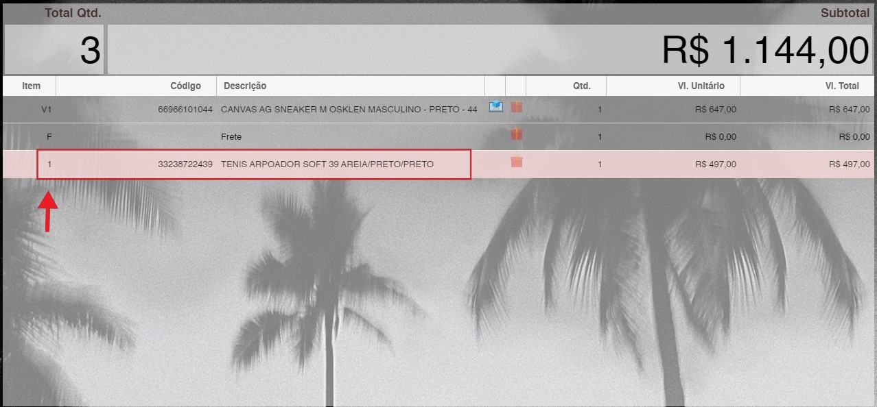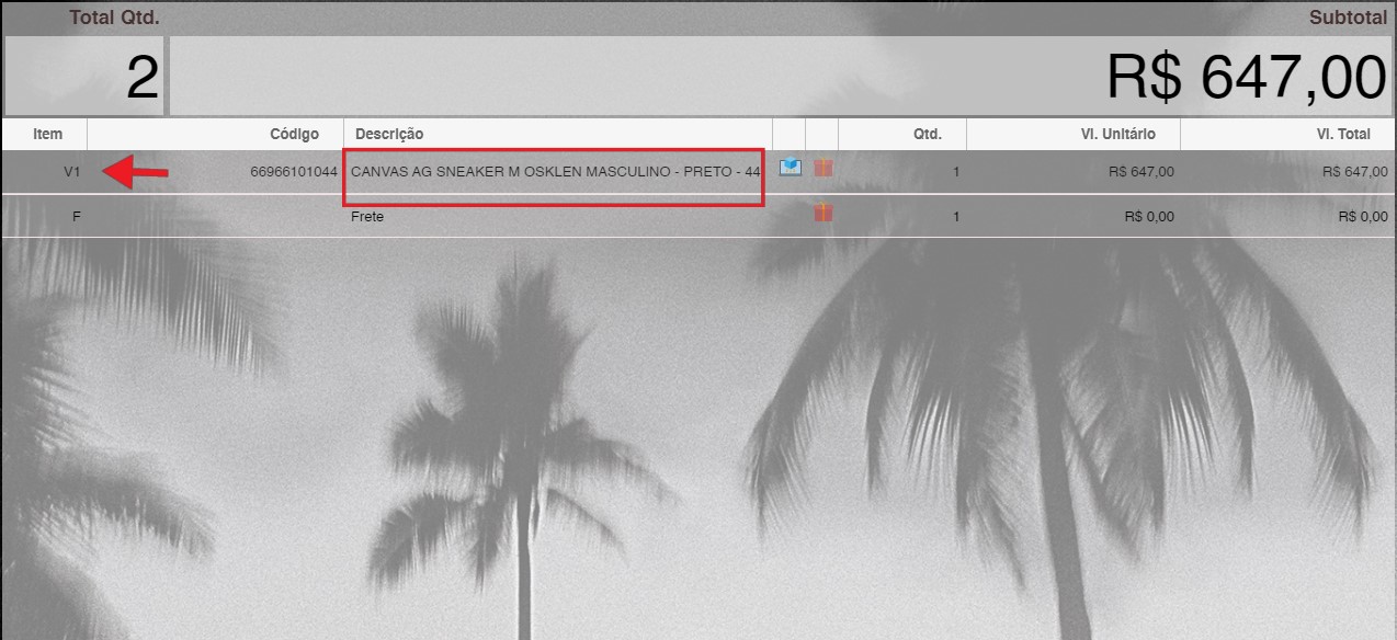 - Ao voltar para o PDV, os itens da venda virtual aparecerão com a letra V e um número na lista de compras.