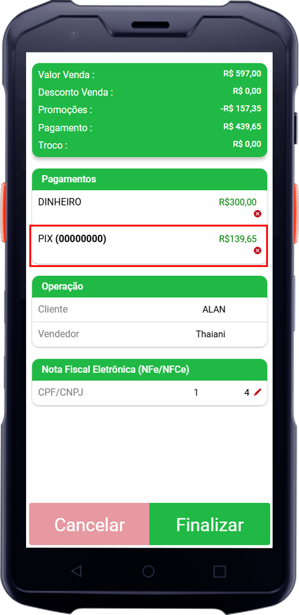 - Na Tela de Pagamento, confira se o Pagamento recebido e o Troco (se houver) estão corretos.