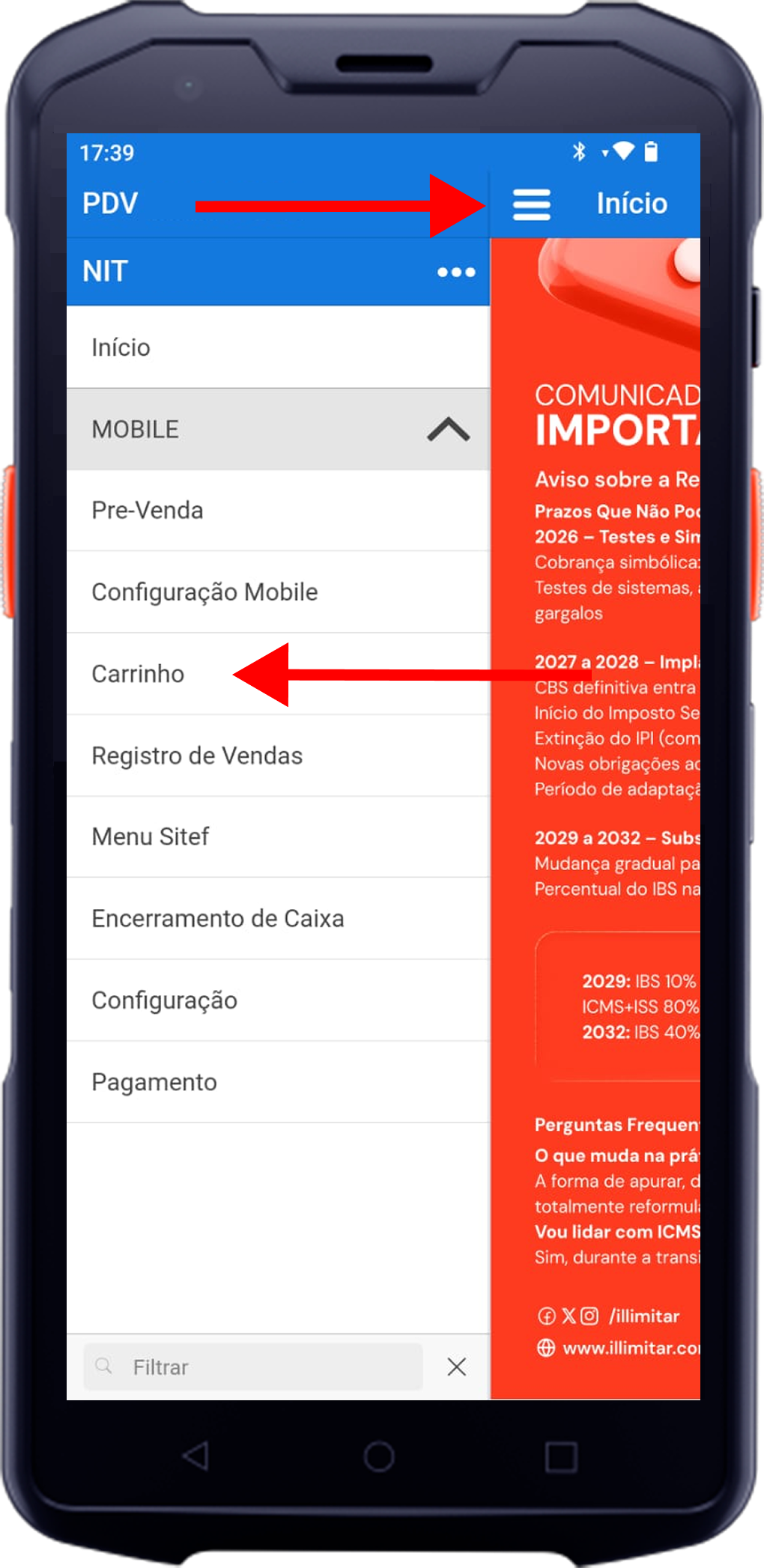 A Tela do Carrinho exibe as principais ferramentas para gerenciar sua venda. Você pode acessá-las através dos Três Pontinhos ou diretamente na tela inicial de busca:
