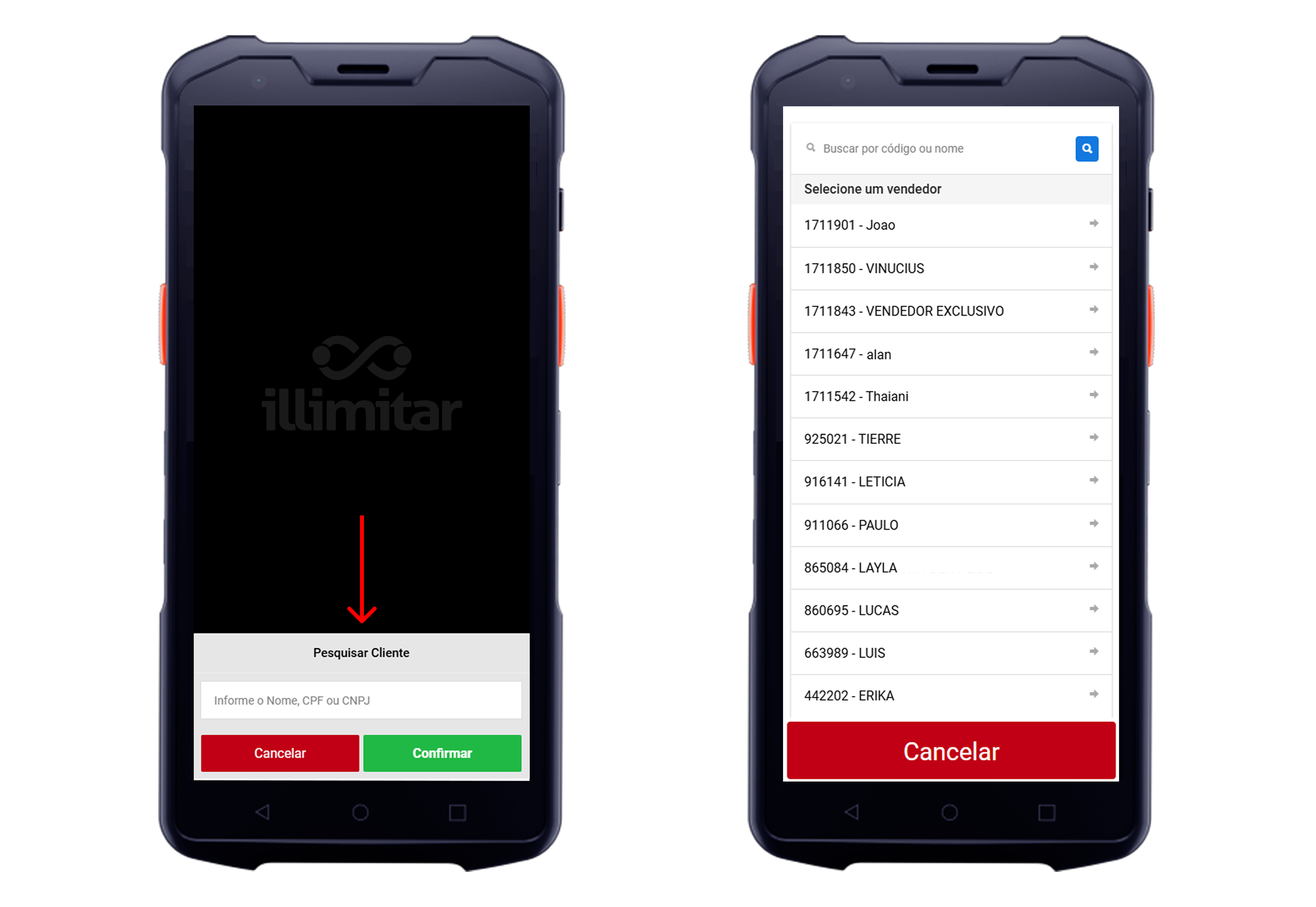 Pesquise por Nome, CPF ou CNPJ. Selecione o Cliente. Selecione o Vendedor.
