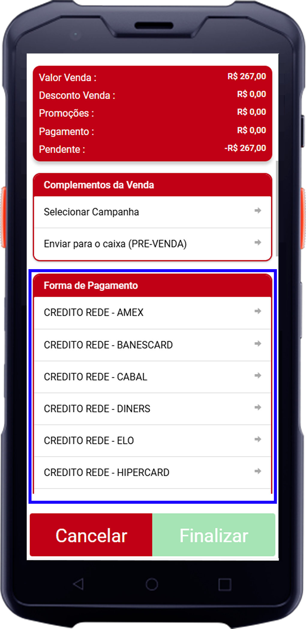 Você pode selecionar a forma de pagamento nas seções DÉBITO, CRÉDITO, DINHEIRO, CARTEIRA DIGITAL e TROCA: