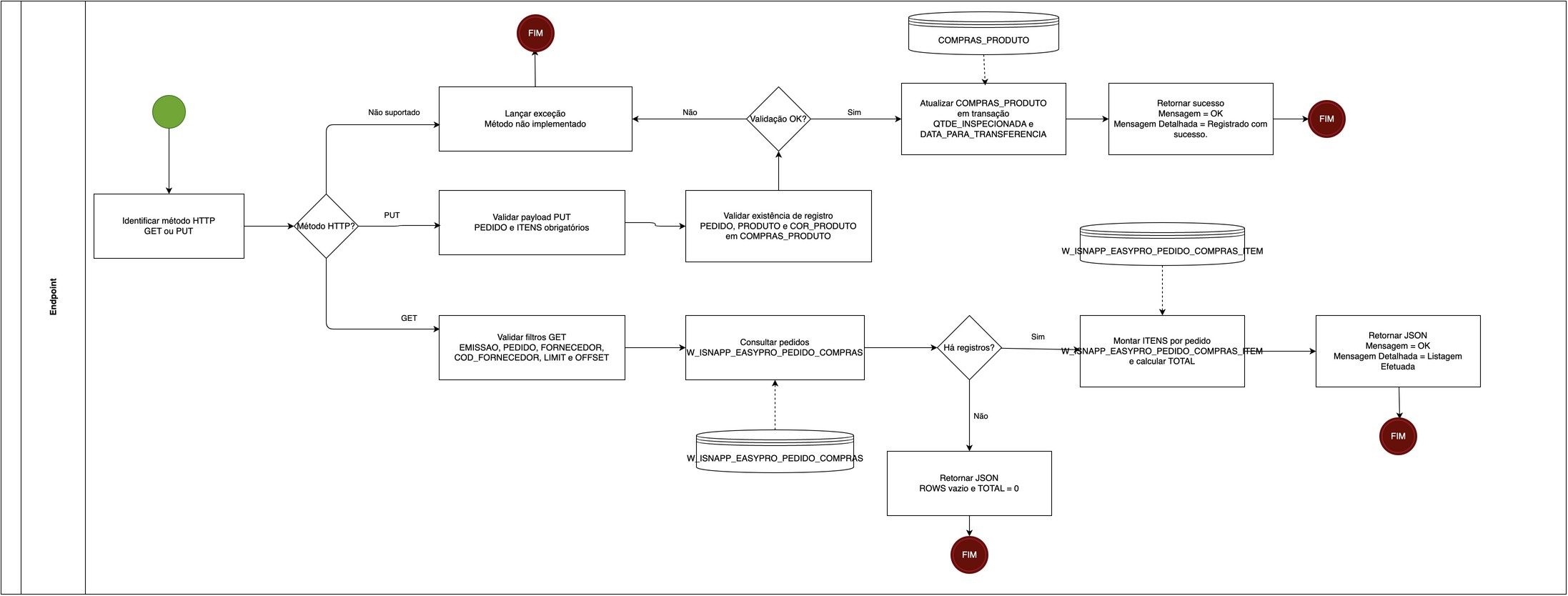 O endpoint recebe parâmetros de consulta para listar pedidos de compra com paginação opcional e detalhes de itens por pedido. No modo de atualização, recebe o número do pedido e a lista de itens inspecionados para atualizar os registros correspondentes.