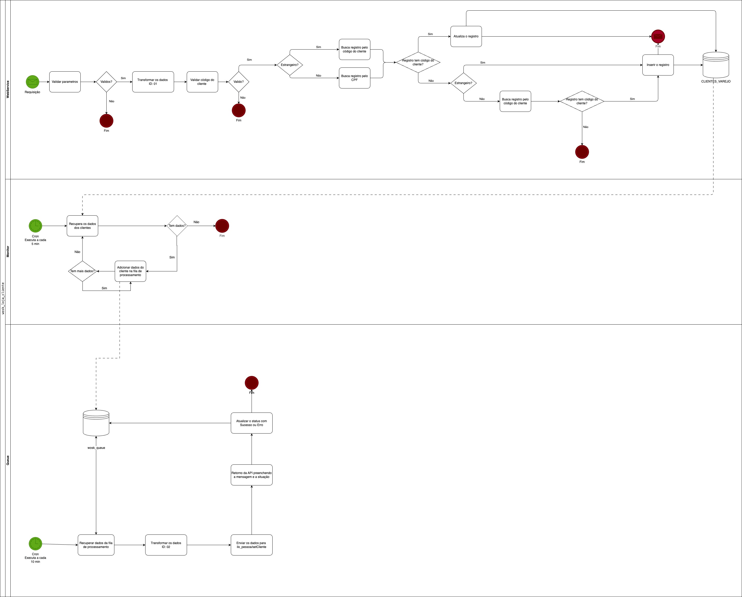 O processo de integração de Cliente Varejo é composto por três componentes principais: WebService, Monitor e Queue, que atuam de forma encadeada e assíncrona para garantir consistência, escalabilidade e rastreabilidade das informações.