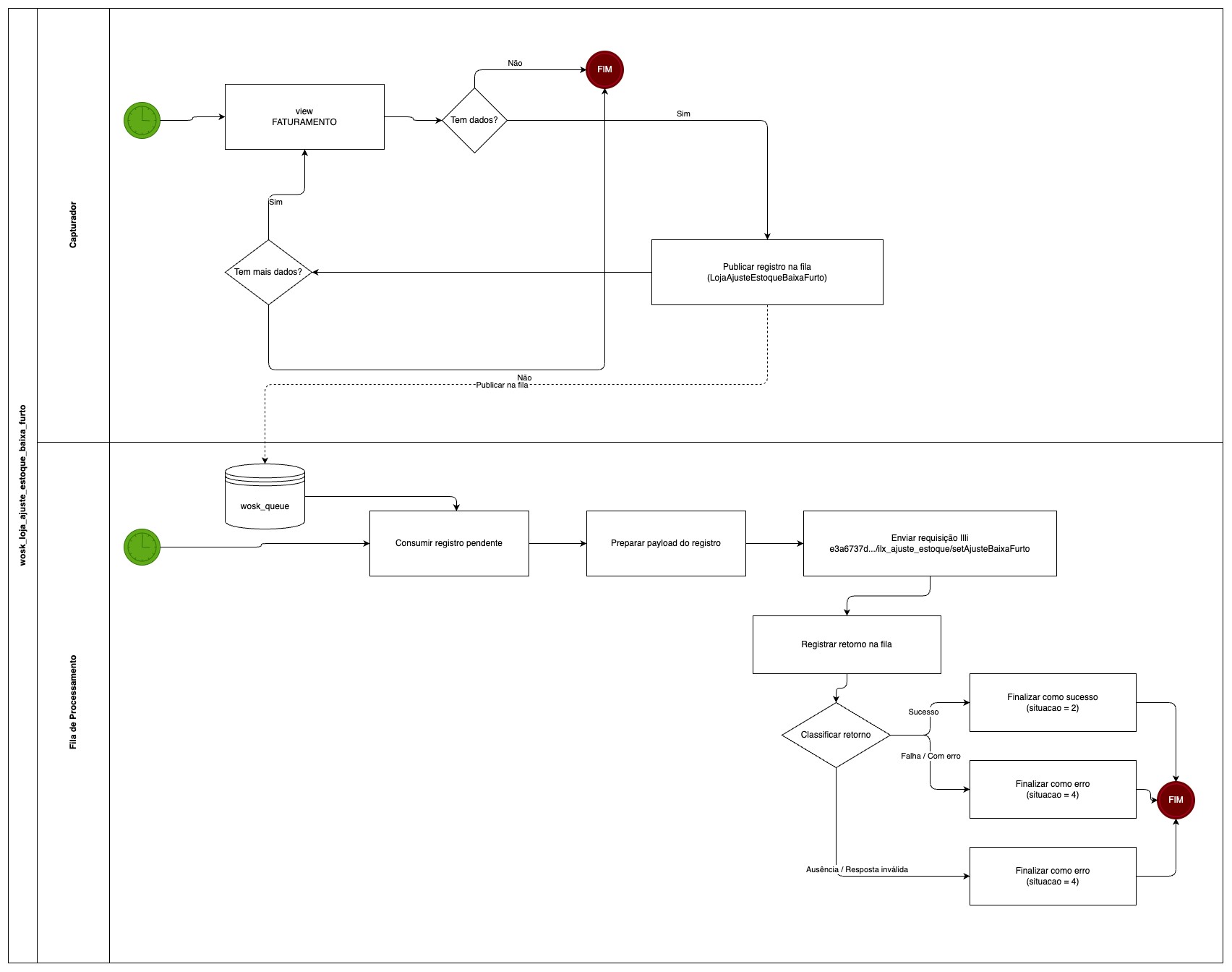 Persistência: grava itens pendentes na Fila de Processamento, com serviço LojaAjusteEstoqueBaixaFurto e chave FILIAL-SERIE_NF-NF_SAIDA (preservando token existente quando aplicável na recaptura); o estado do capturador mantém offset, chave de posição, data de posição, filtro e situação (parado, em execução, concluído ou erro).