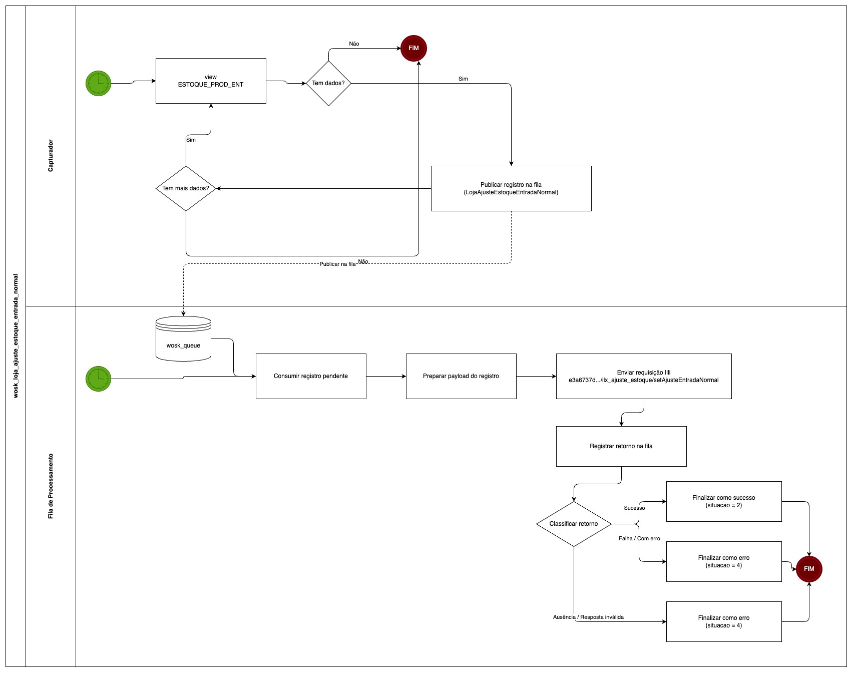 | Capturador | Captura automática | Deve aplicar filtros de romaneio, tipo de entrada e data mínima, anexar itens e gravar na fila com serviço LojaAjusteEstoqueEntradaNormal. |