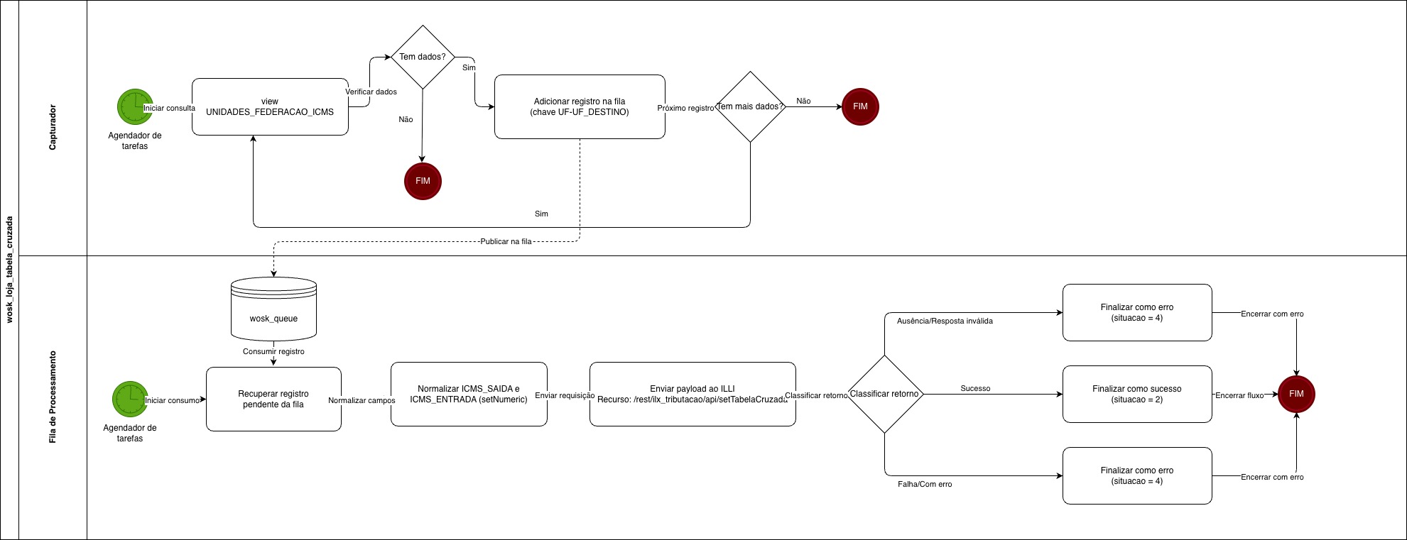 A captura automática consulta UNIDADES_FEDERACAO_ICMS quando o serviço LojaTabelaCruzada está apto, com data mínima padrão quando o filtro está vazio, ordenação por DATA_PARA_TRANSFERENCIA e paginação conforme o limite configurado para o serviço LojaTabelaCruzada.