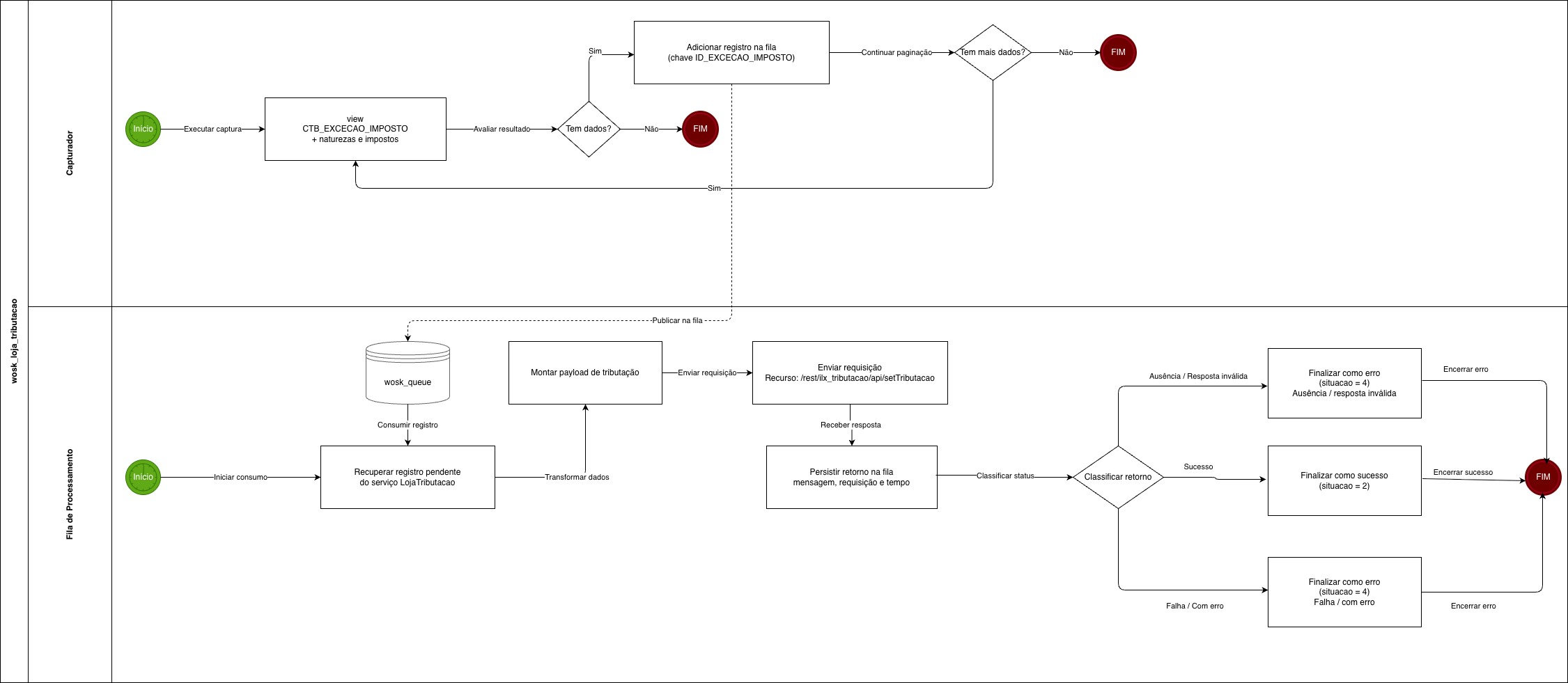 | Fila de Processamento | Integração | Deve enviar o payload completo ao atualiza tributação e persistir retorno na tabela da fila de integração. |